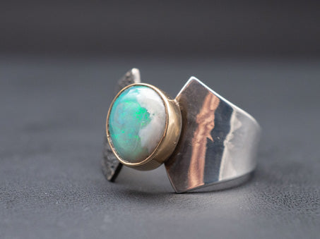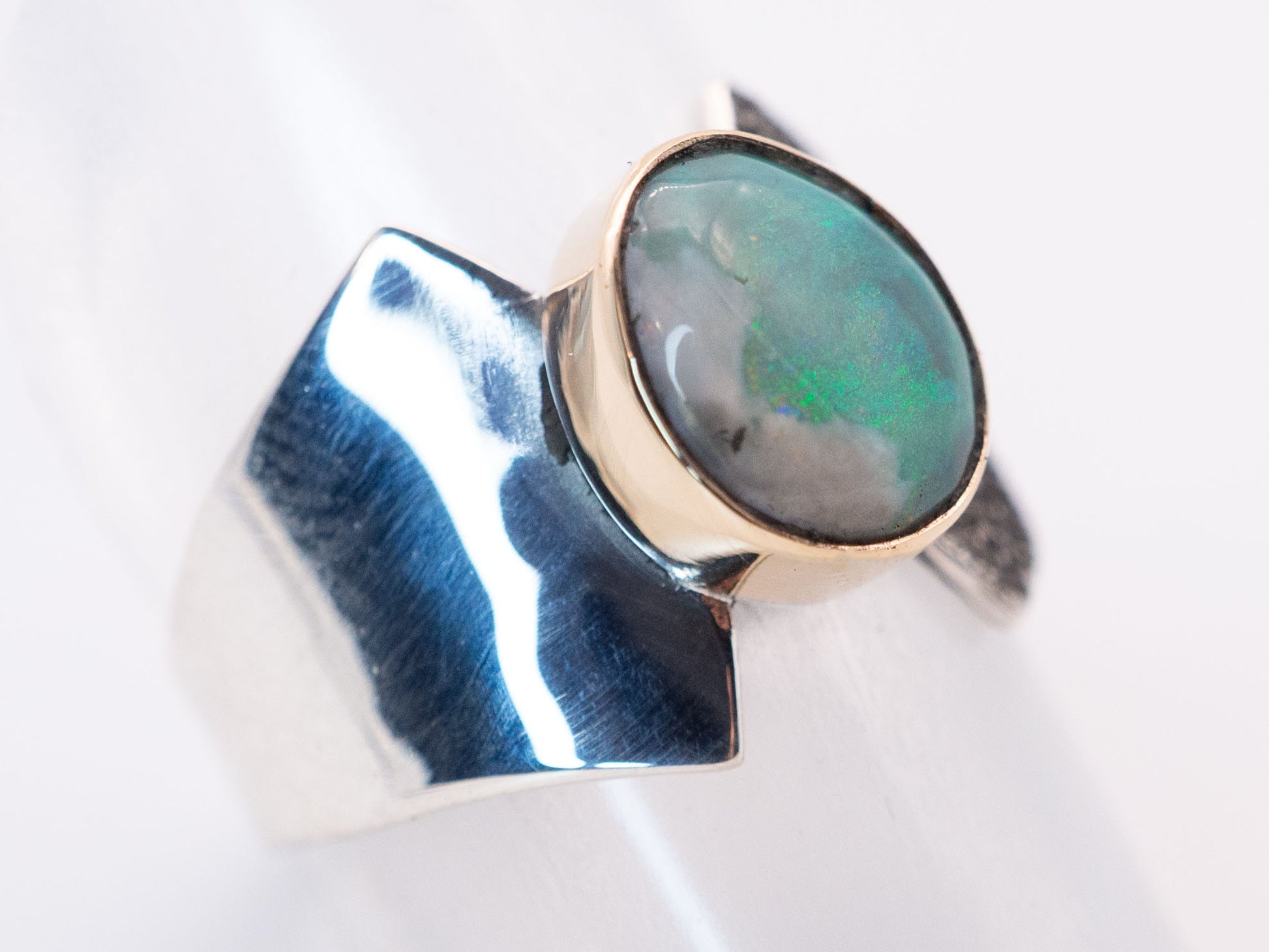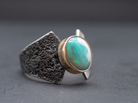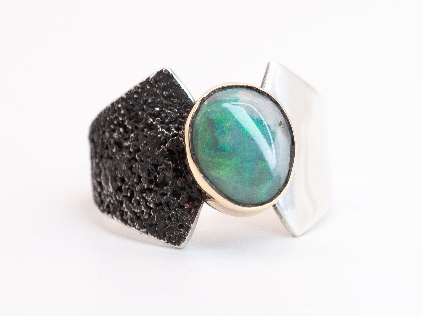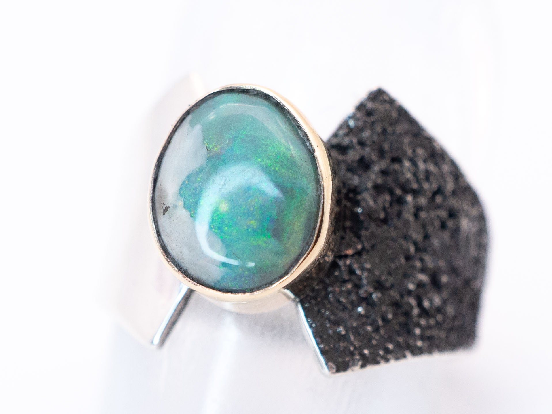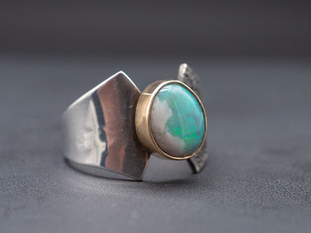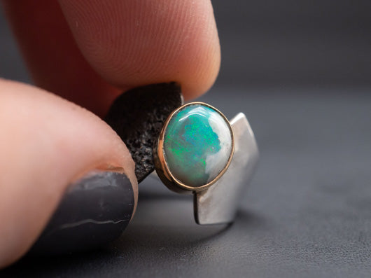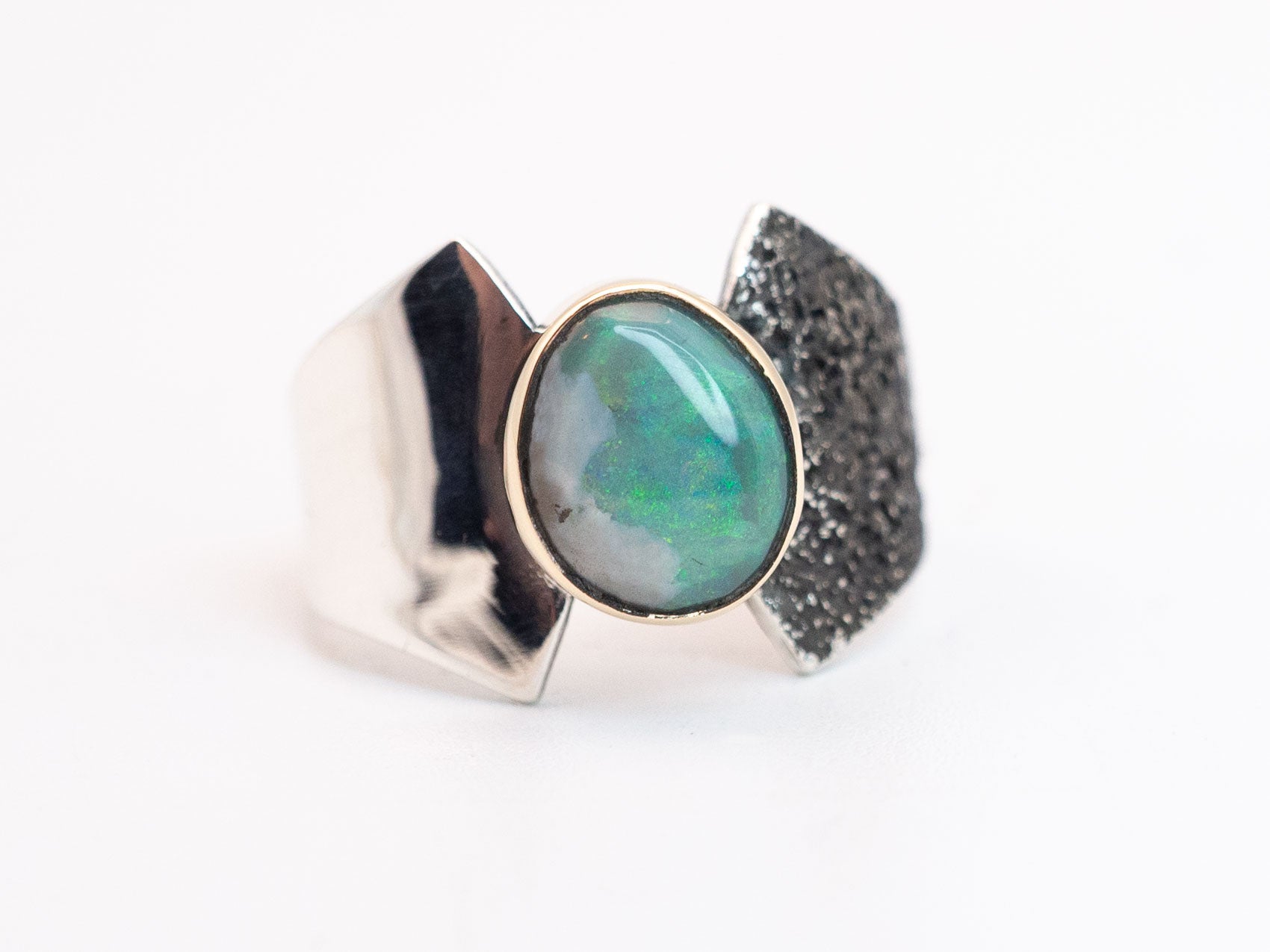 A ring of balance. This sculptural ring features a solid Lightning Ridge opal we cut in house, set in 14k yellow gold. The band is hand fabricated in .925 silver.