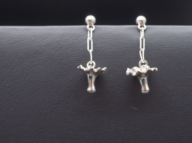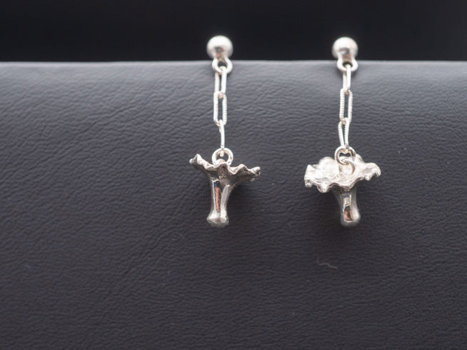 These delicate Chanterelle Mushroom Earrings feature a Sterling Silver Chanterelle Mushroom hanging from a silver chain. Earrings are worn with a sterling silver stud with a matching ear-nut chosen for comfort and security. These beautifully crafted earrings pair well with any occasion, sure to turn up the vibes on any outfit.
