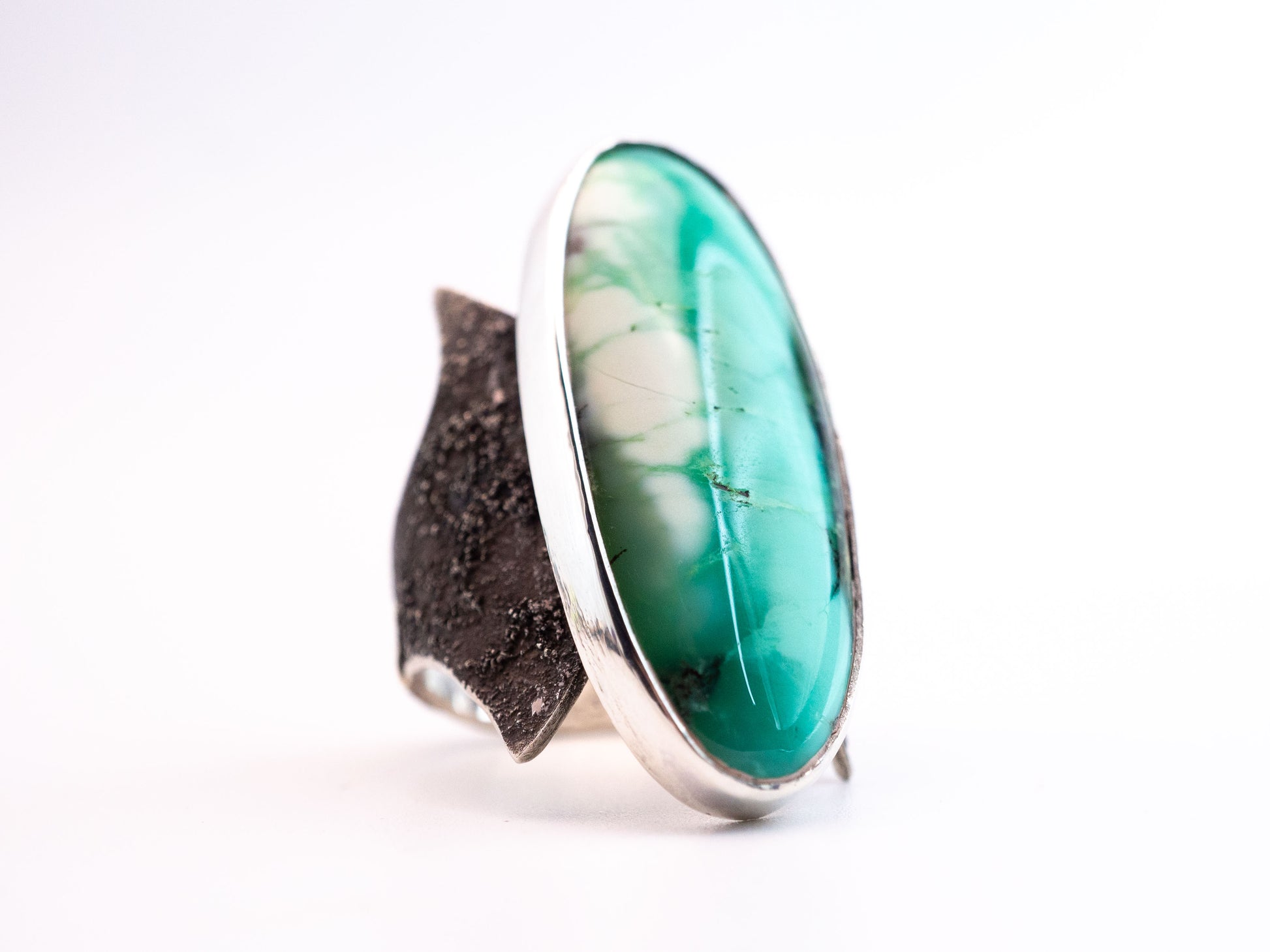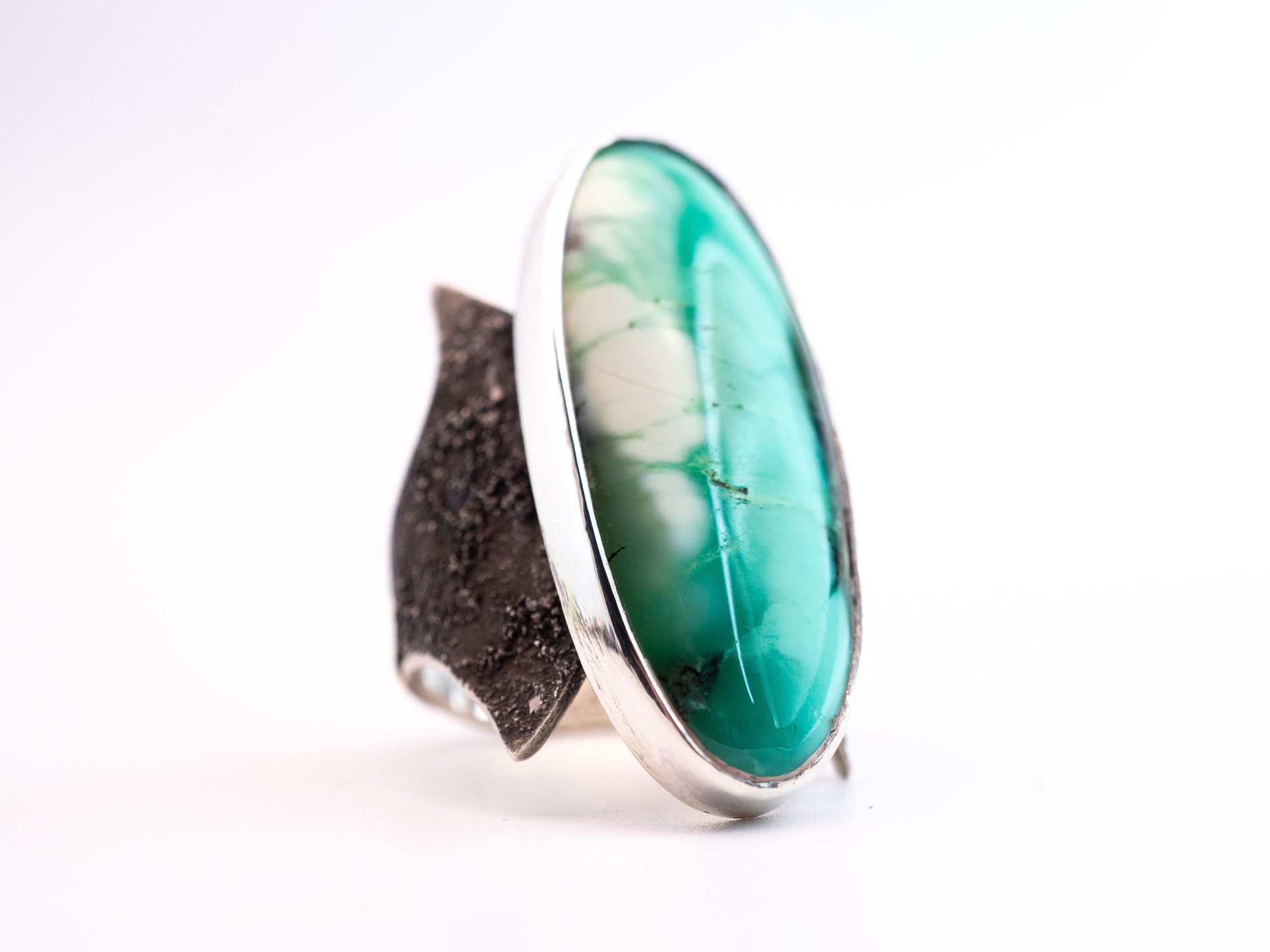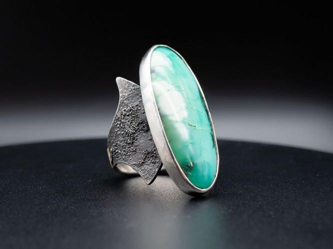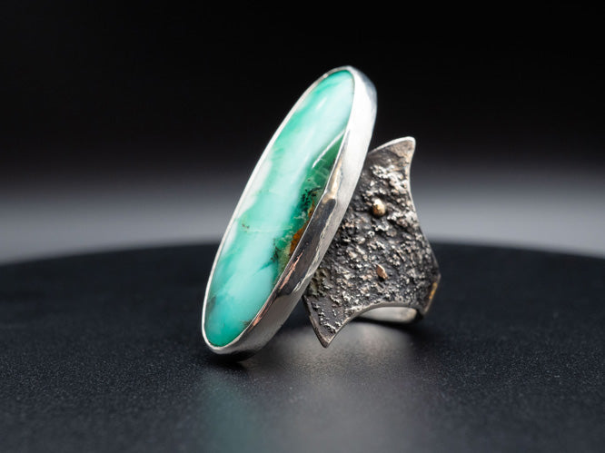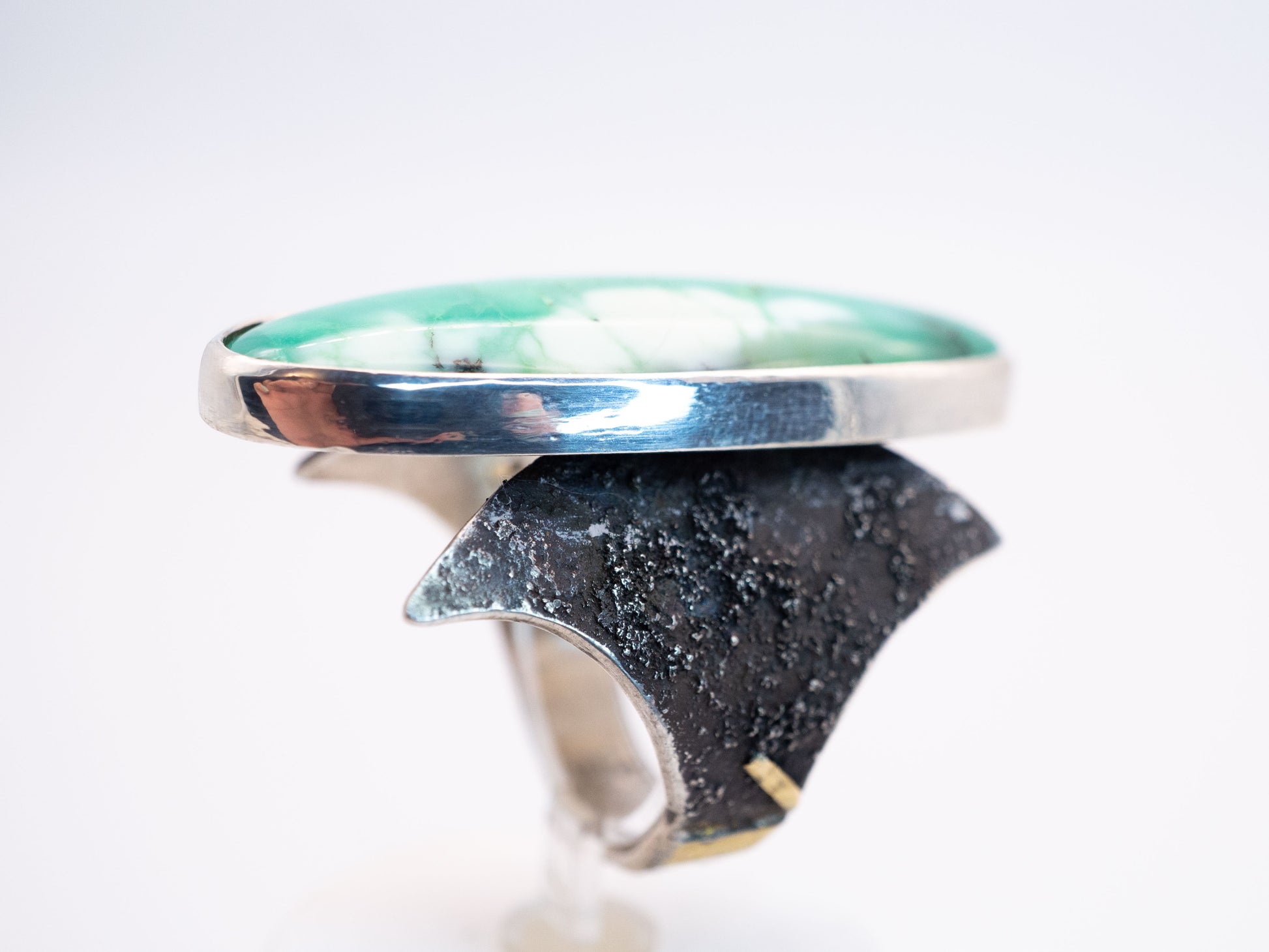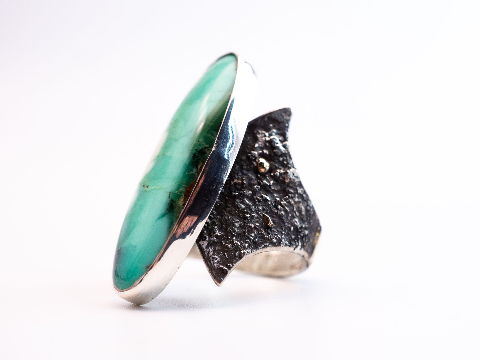 This ring features a lovely piece of Australian Chrysoprase surrounded by a highly textured black silver band. The dark band is accented with areas of 24k gold keum boo. The main stone is a gorgeous piece of Australian mined Chrysoprase, it sits in a handmade, polished silver, hammer set bezel. This bold ring will energize you with its striking color and contrasting anice t appeal. The unique architecture will compliment you in any situation, whether formal or casual.