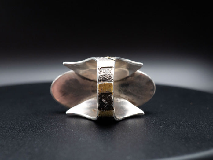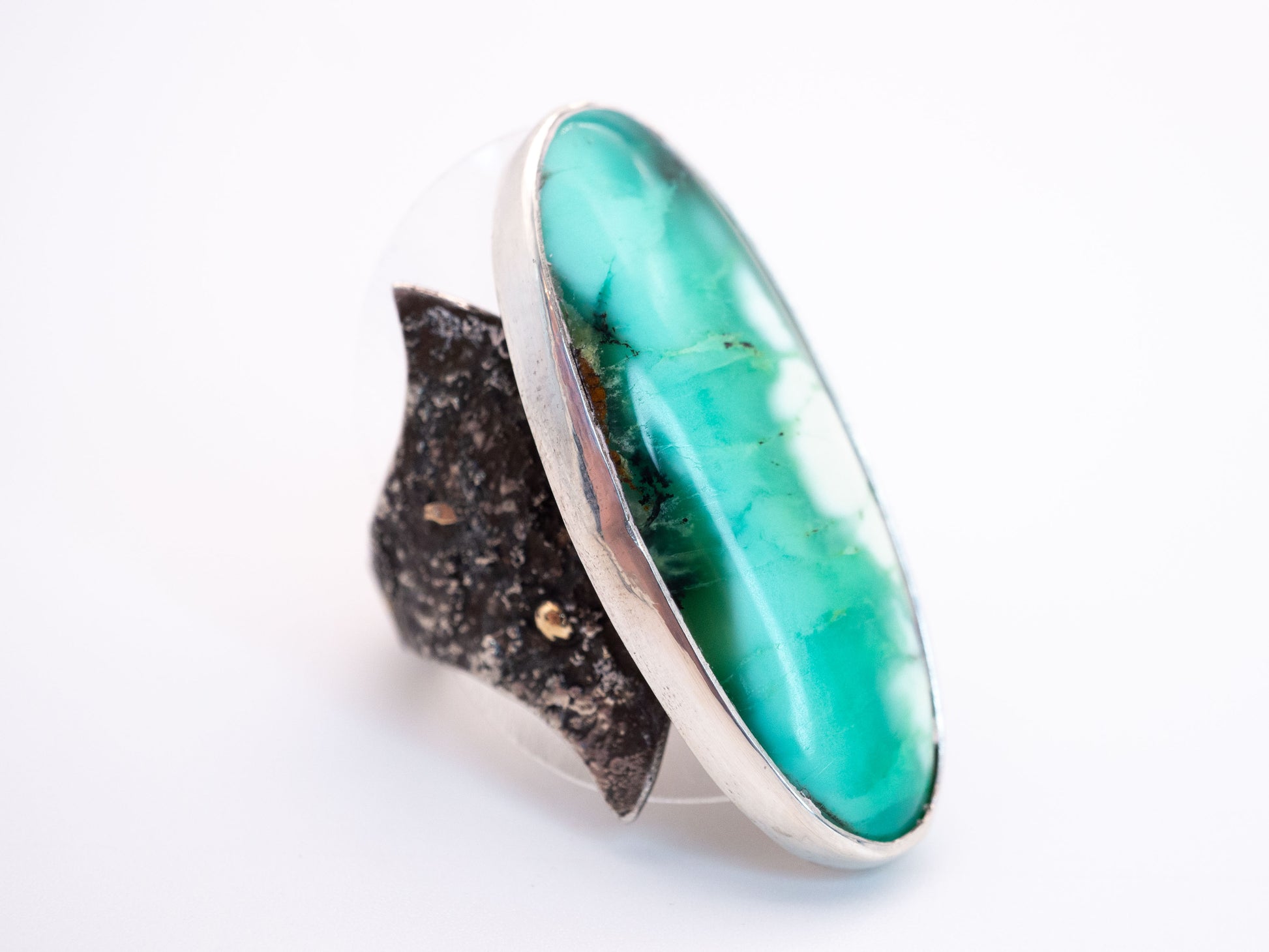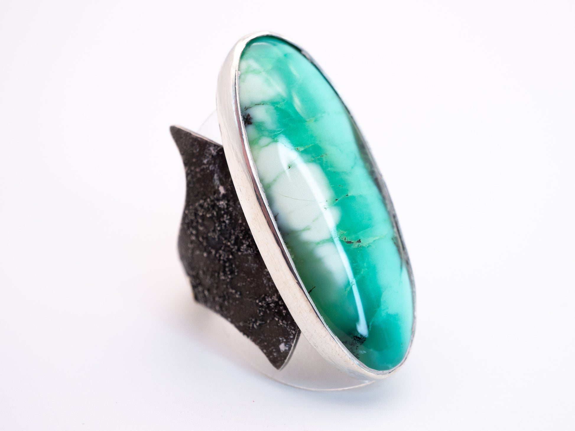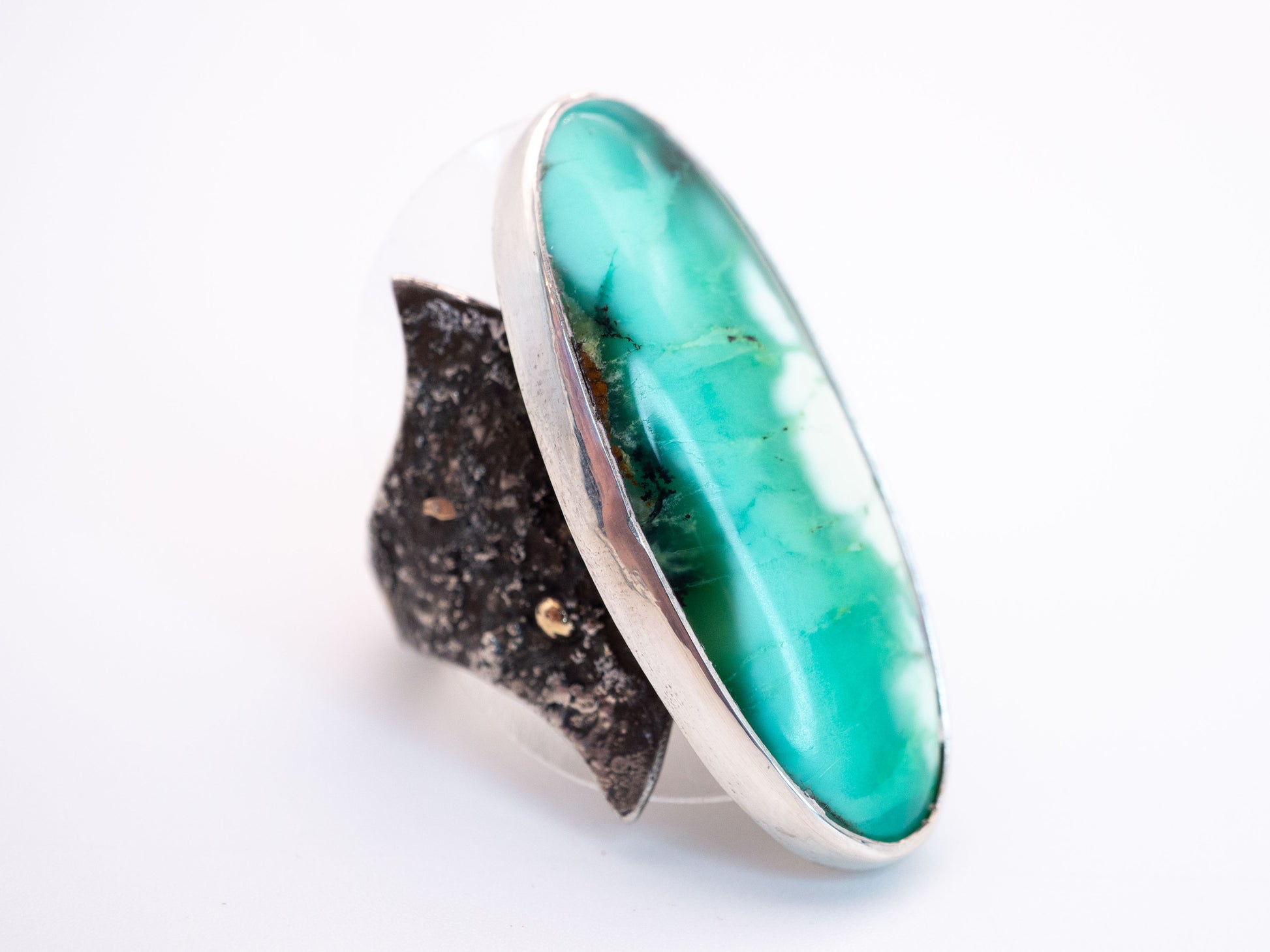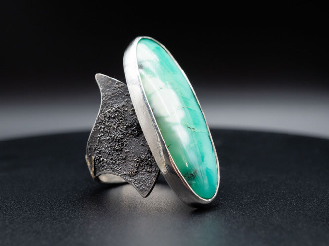 This ring features a lovely piece of Australian Chrysoprase surrounded by a highly textured black silver band. The dark band is accented with areas of 24k gold keum boo. The main stone is a gorgeous piece of Australian mined Chrysoprase, it sits in a handmade, polished silver, hammer set bezel. This bold ring will energize you with its striking color and contrasting anice t appeal. The unique architecture will compliment you in any situation, whether formal or casual.