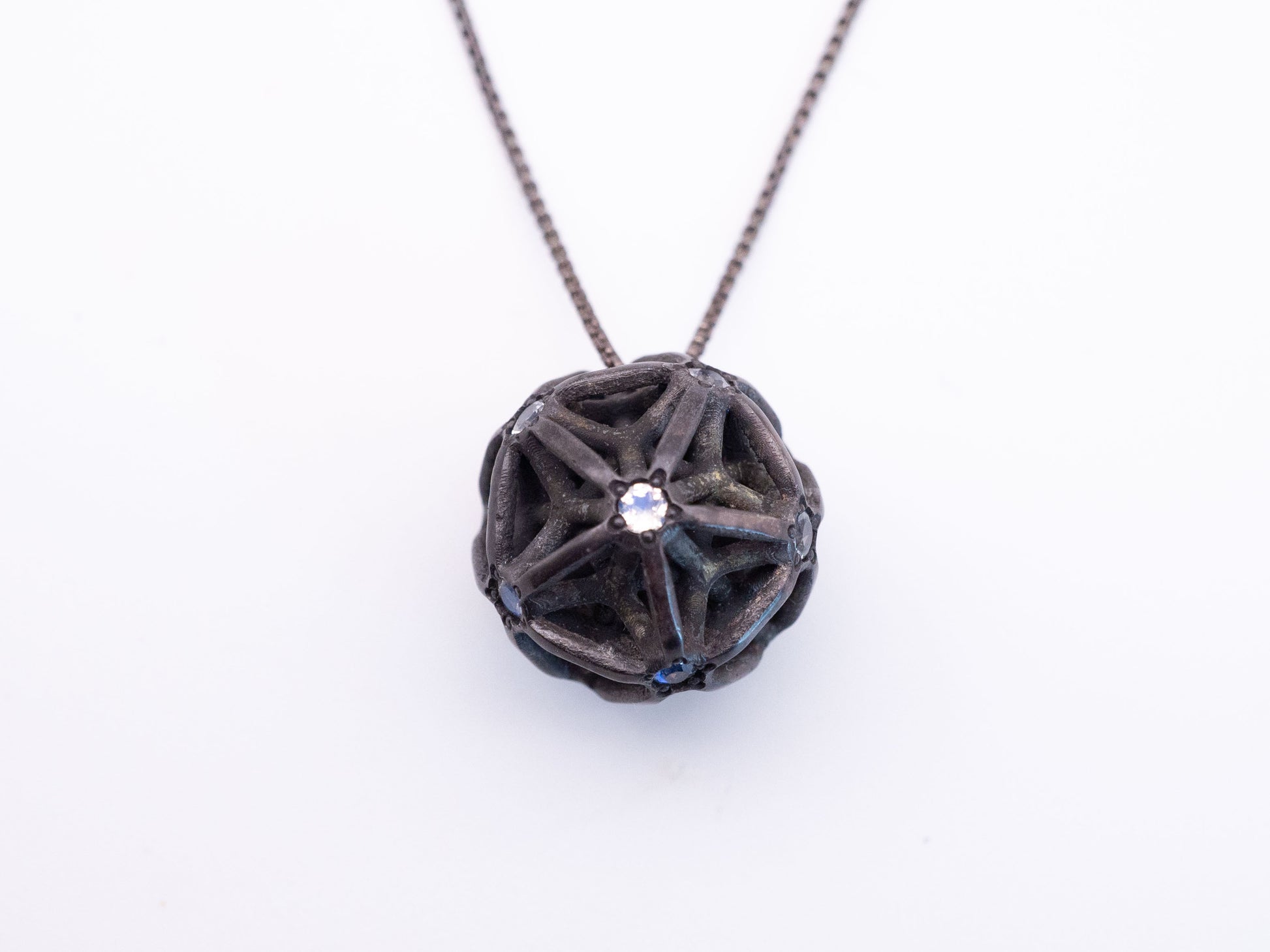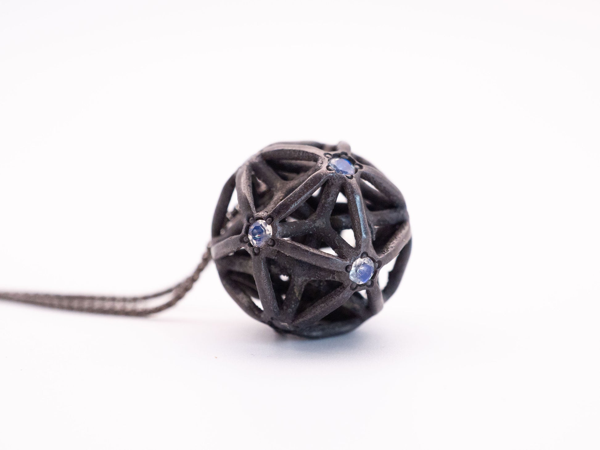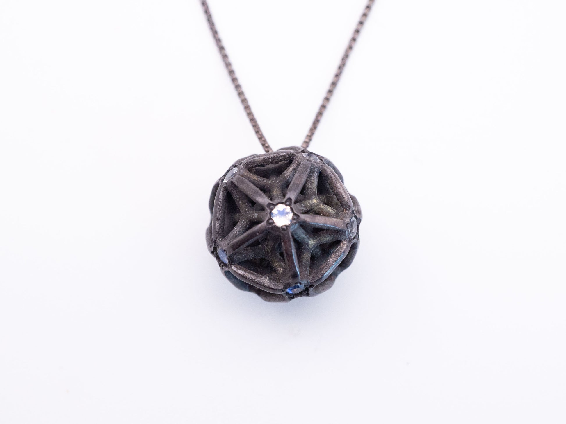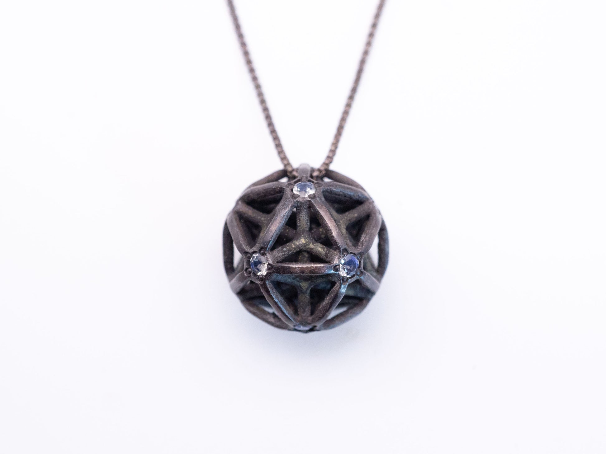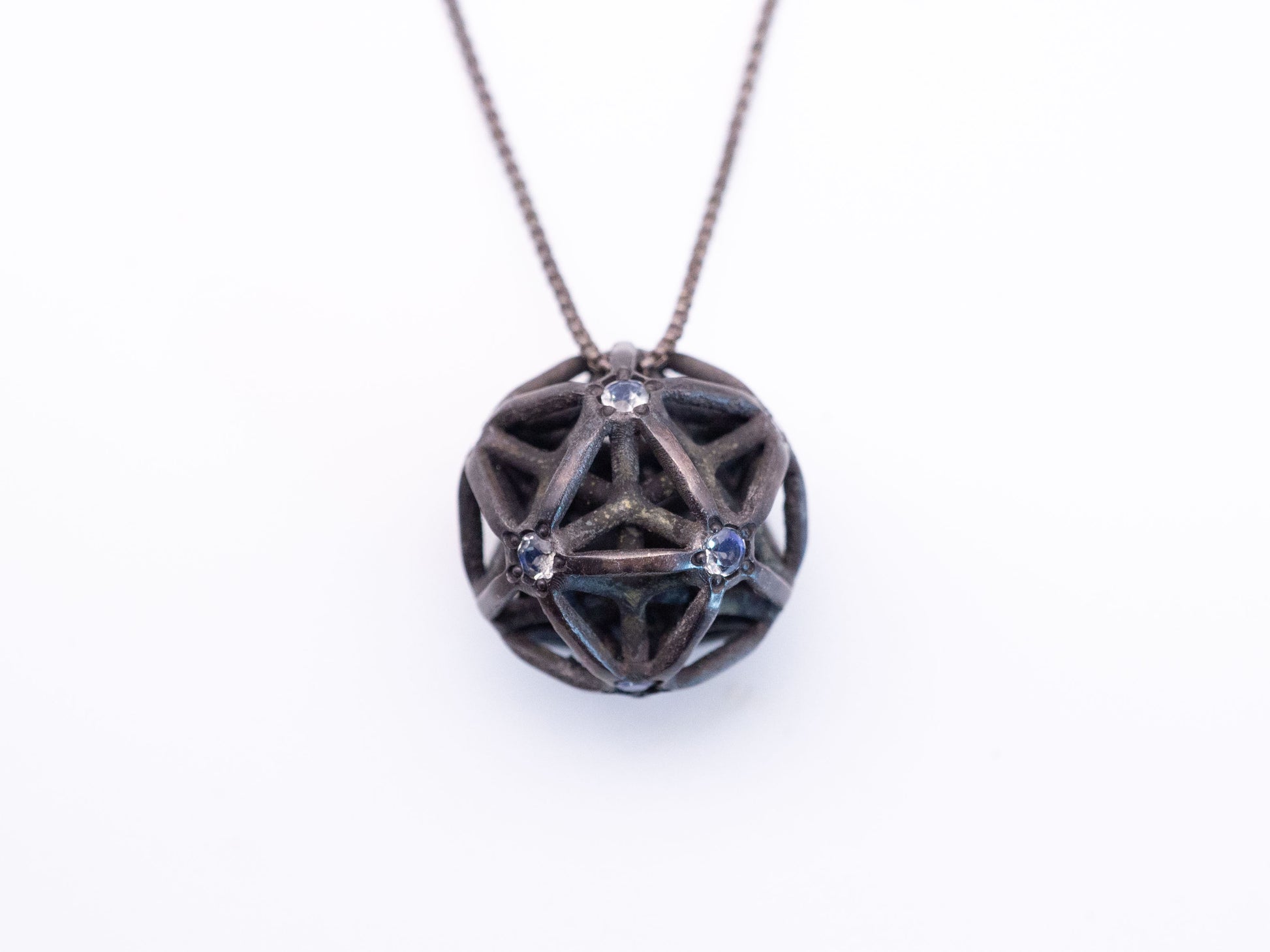Encase the luminescent dance of the cosmos around your neck with this silver cast pendant, intricately entwined to represent the illusionary web of Maya. At its heart, a natural moonstone gleams with an ethereal light, known for its connection to intuition and feminine energy, offering a guiding glow amidst life's intricate entanglements. This mystical piece, complete with a 21" adjustable chain, serves as a beacon of clarity, an amulet to navigate the beautiful maze of existence with celestial grace.