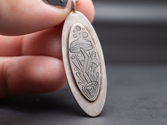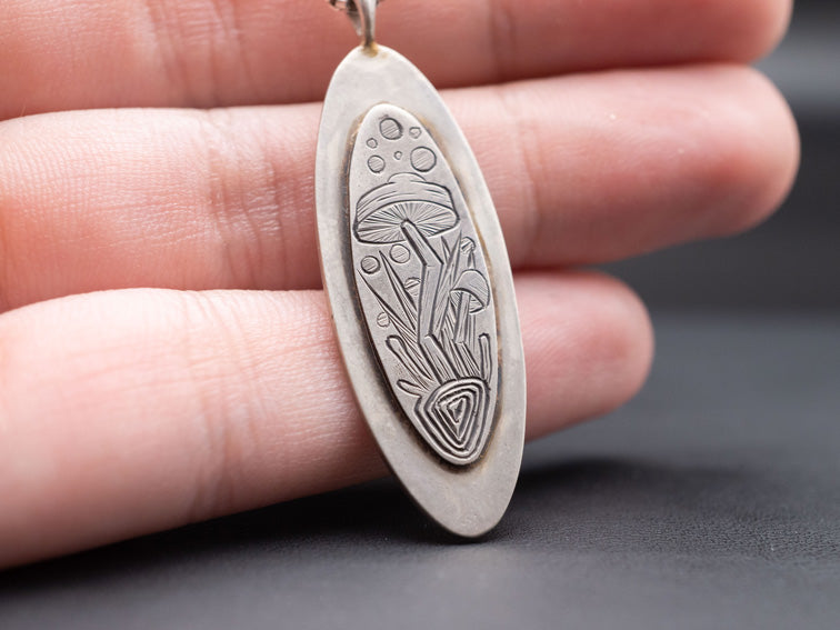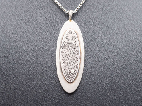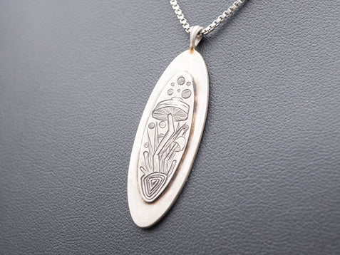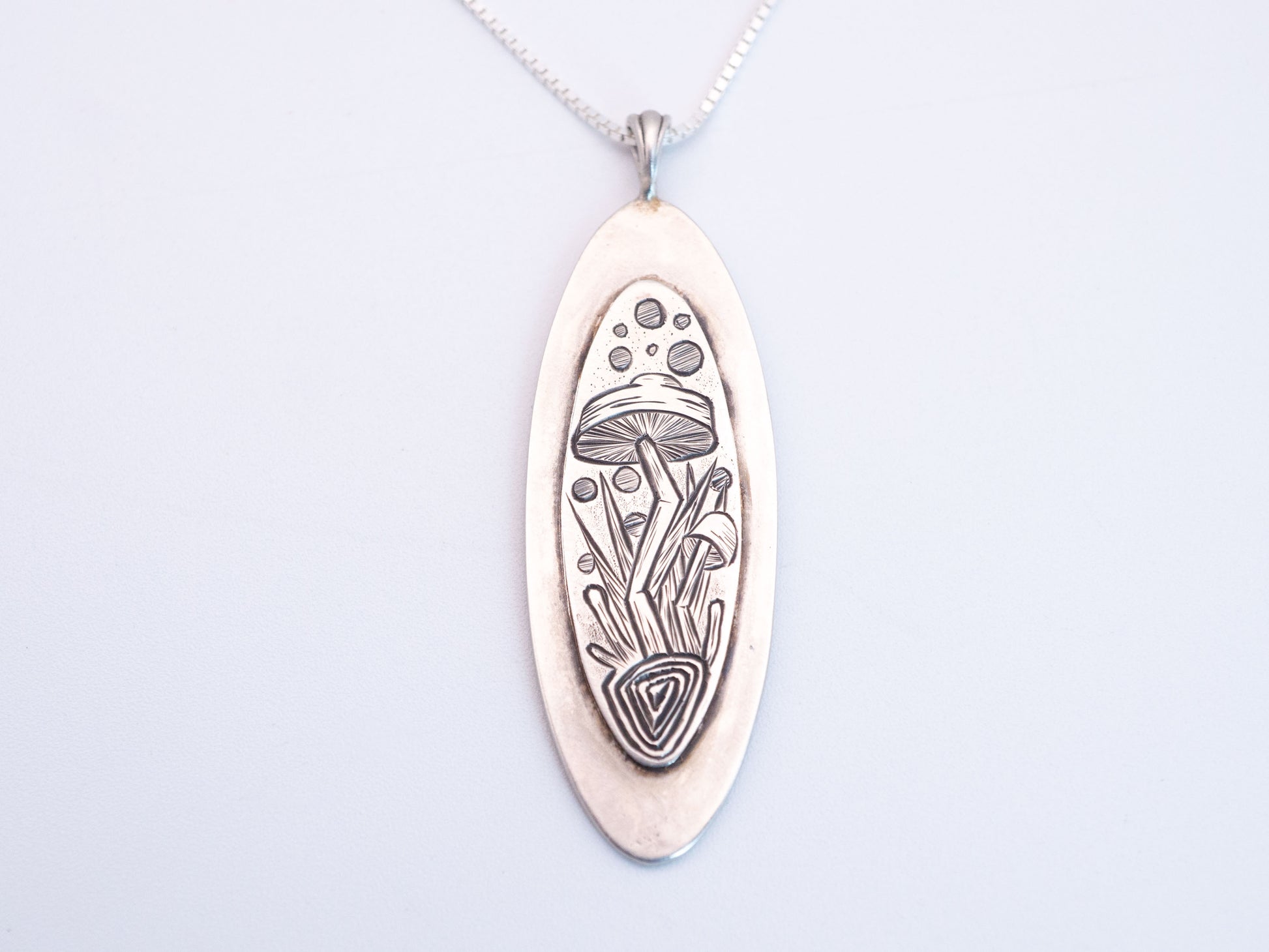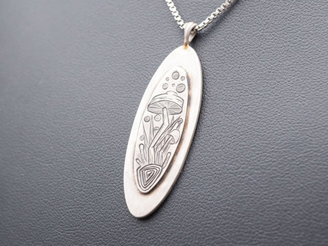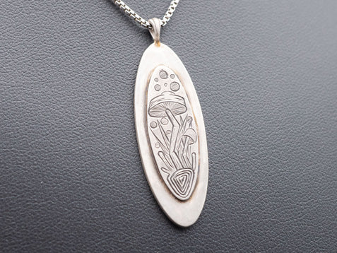 This pendant features a set of hand engraved Mushrooms on Sterling Silver. Comes with a 21” Adjustable Silver chain.