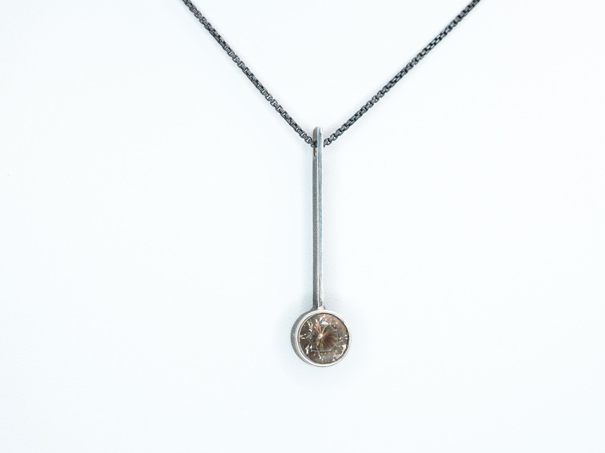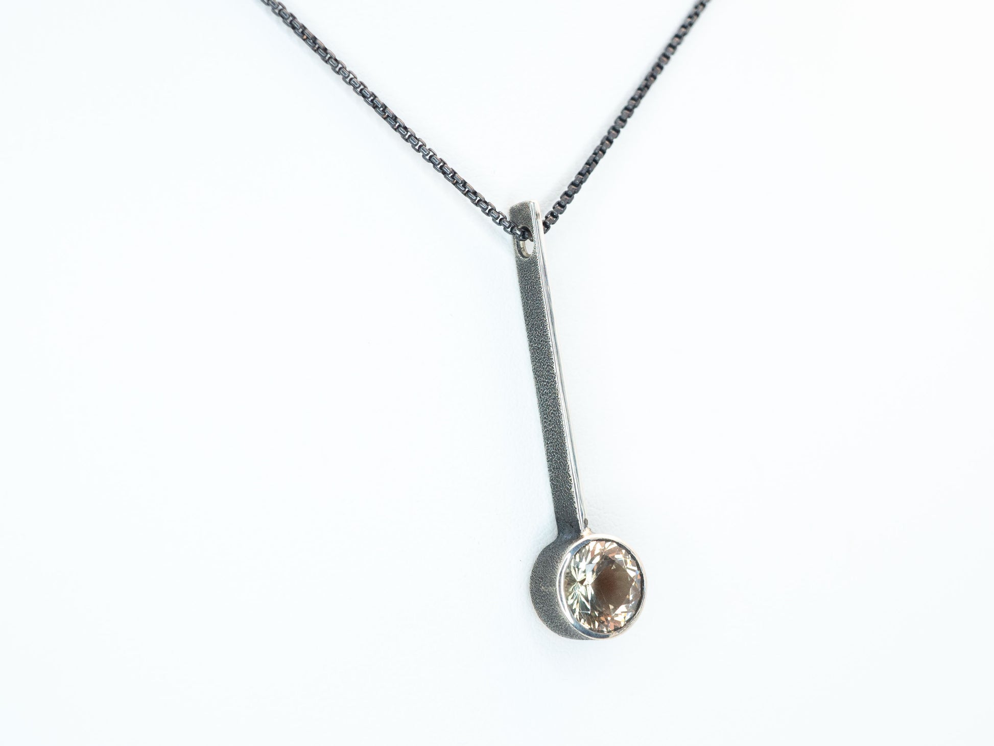 This monolithic pendant was forged to offer a sense of peace and joy to the wearer. The brilliant Natural Oregon Sunstone set in this piece was hand picked from the deserts of Eastern Oregon. Sunstone is a stone of benevolence strength, mental clarity, openness and love.