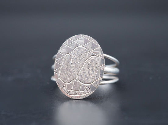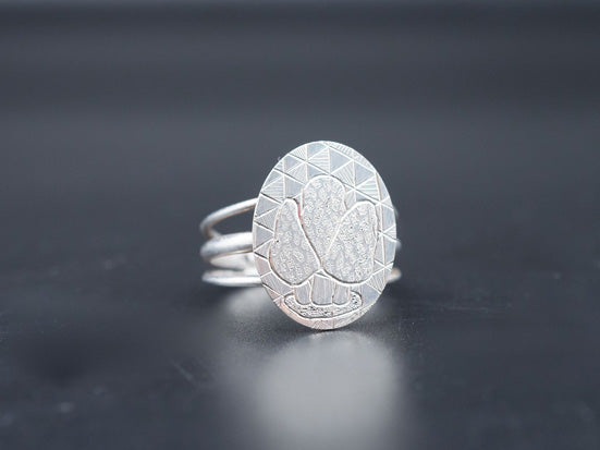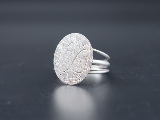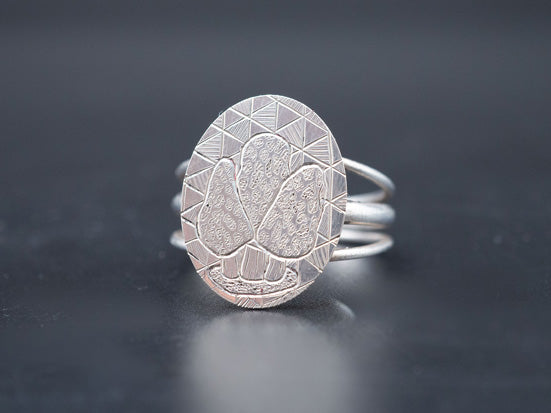 Hand Engraved Morel Signet Ring with geometric background. Made to order in the size of your choosing. Set with a delicate Sterling Silver band (as pictured).