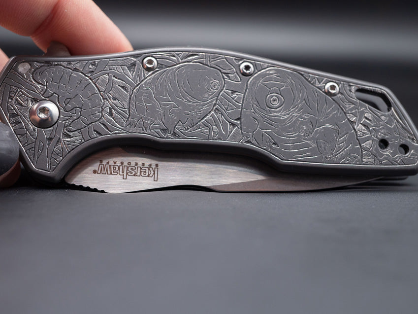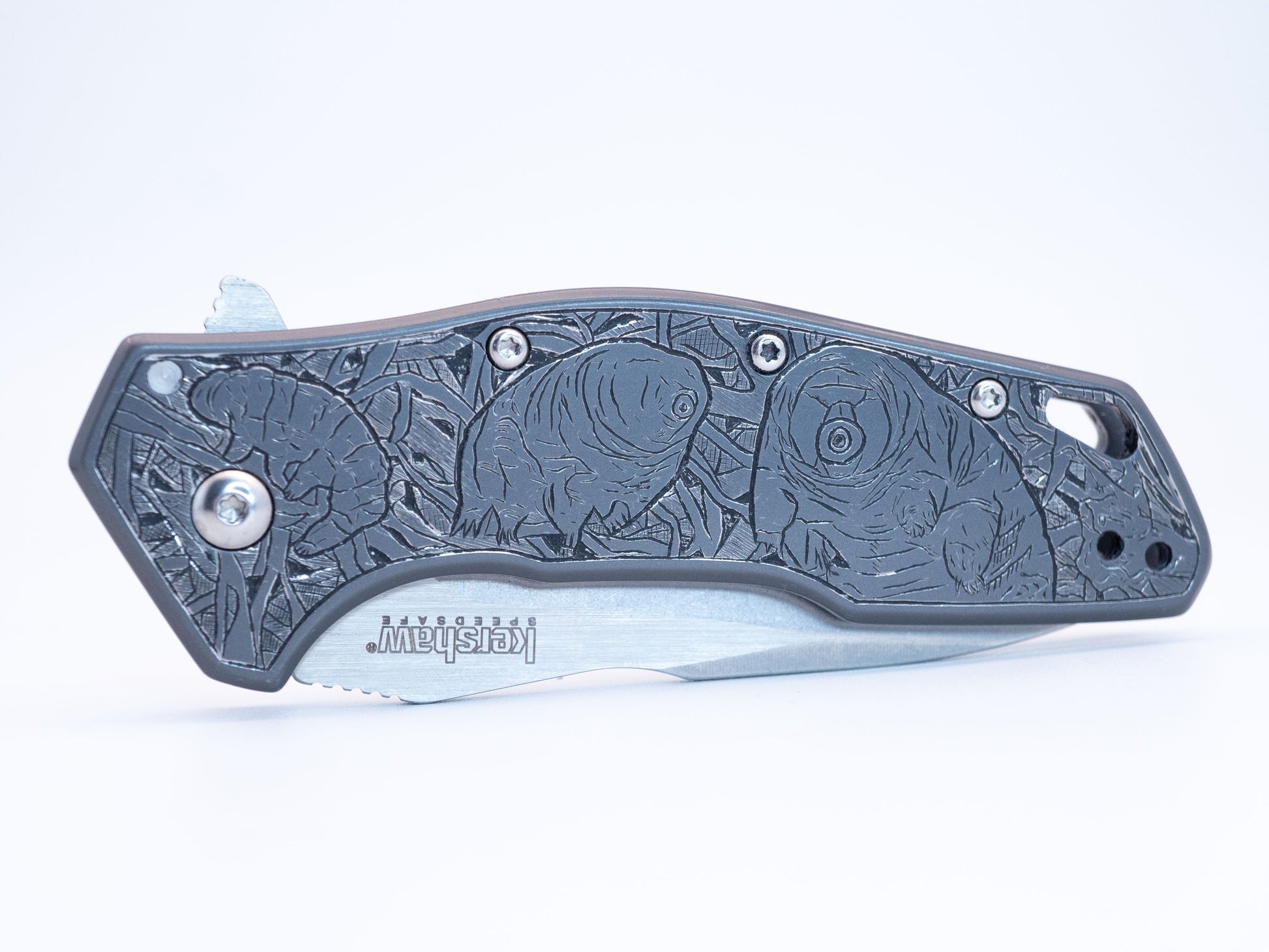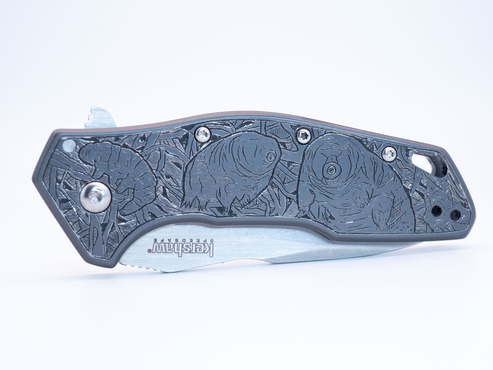 This Kershaw Eris features a beautiful hand engraved design of three tardigrades. The perfect gift for someone that appreciates the tiny biological wonder of these micro-animals.
