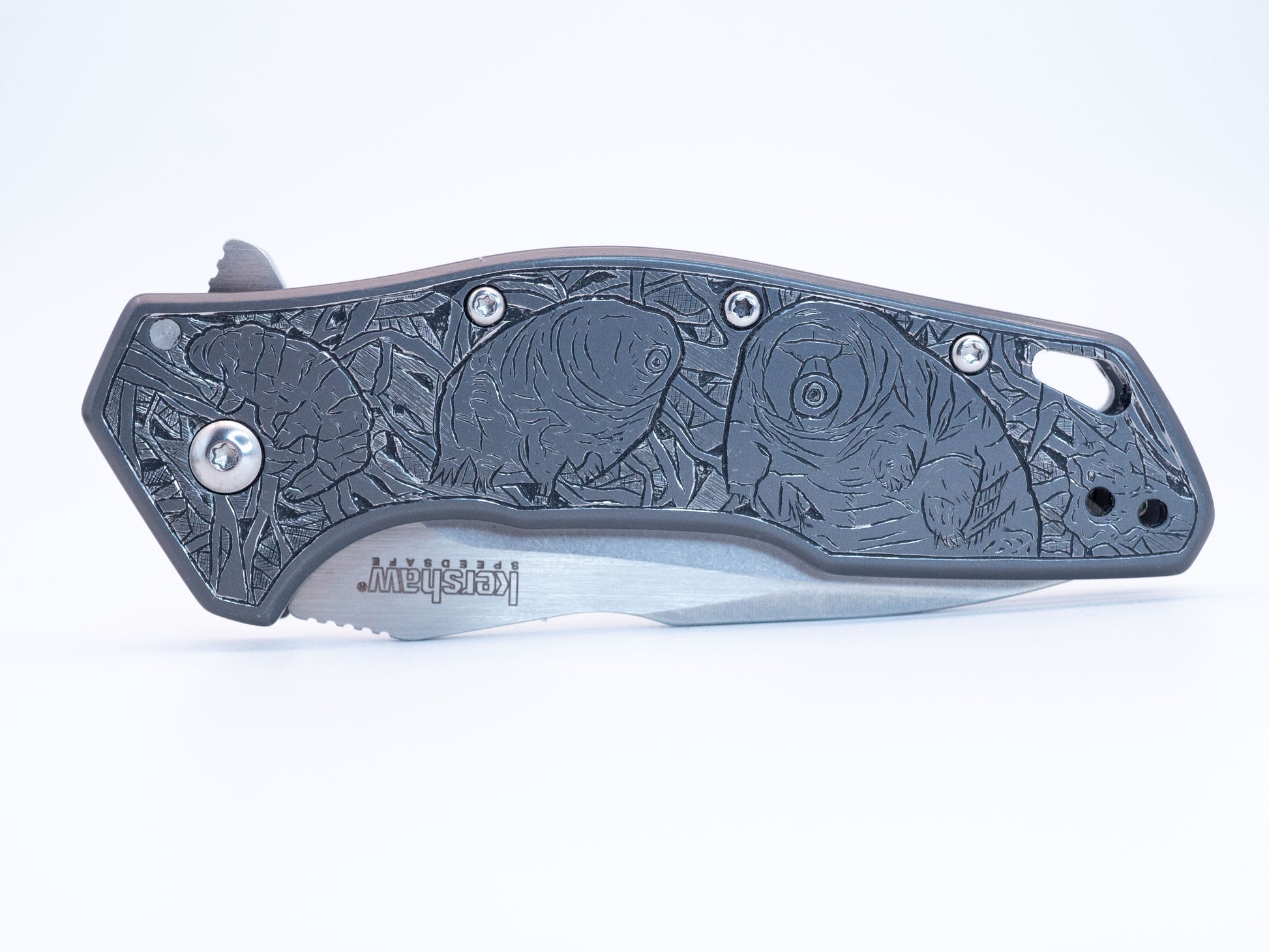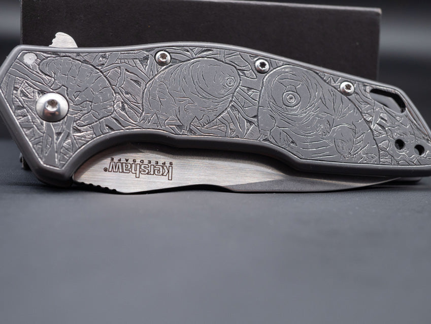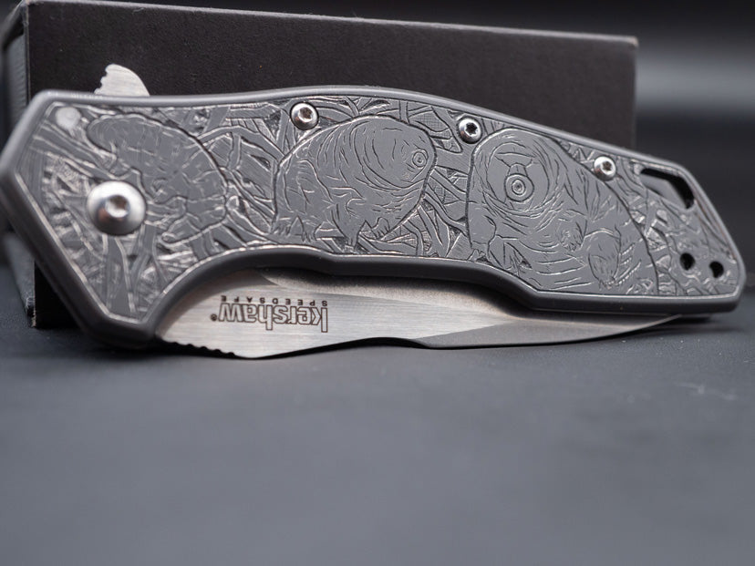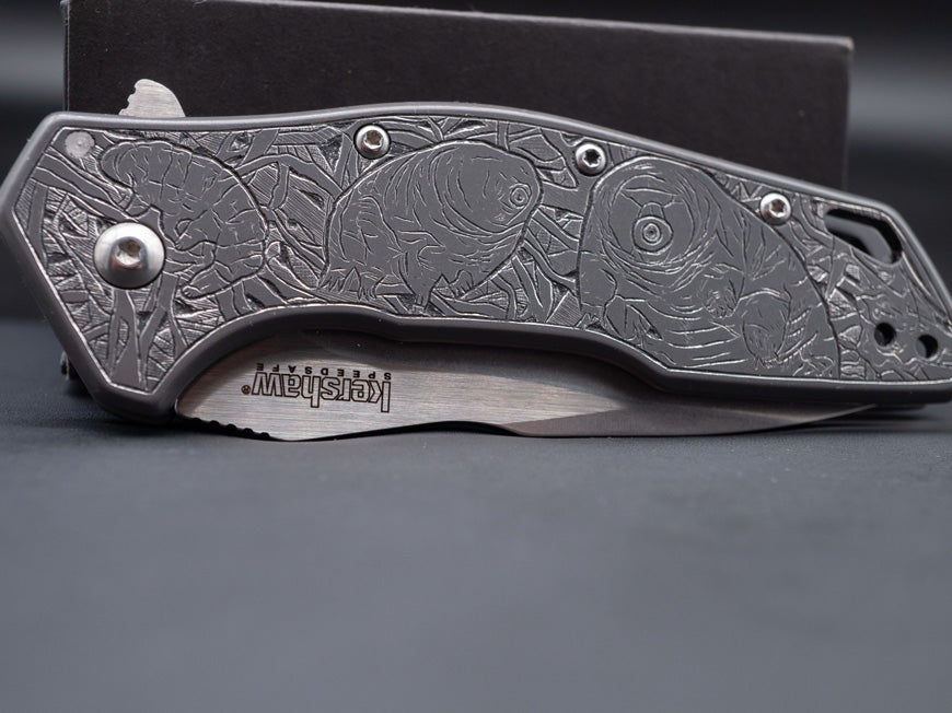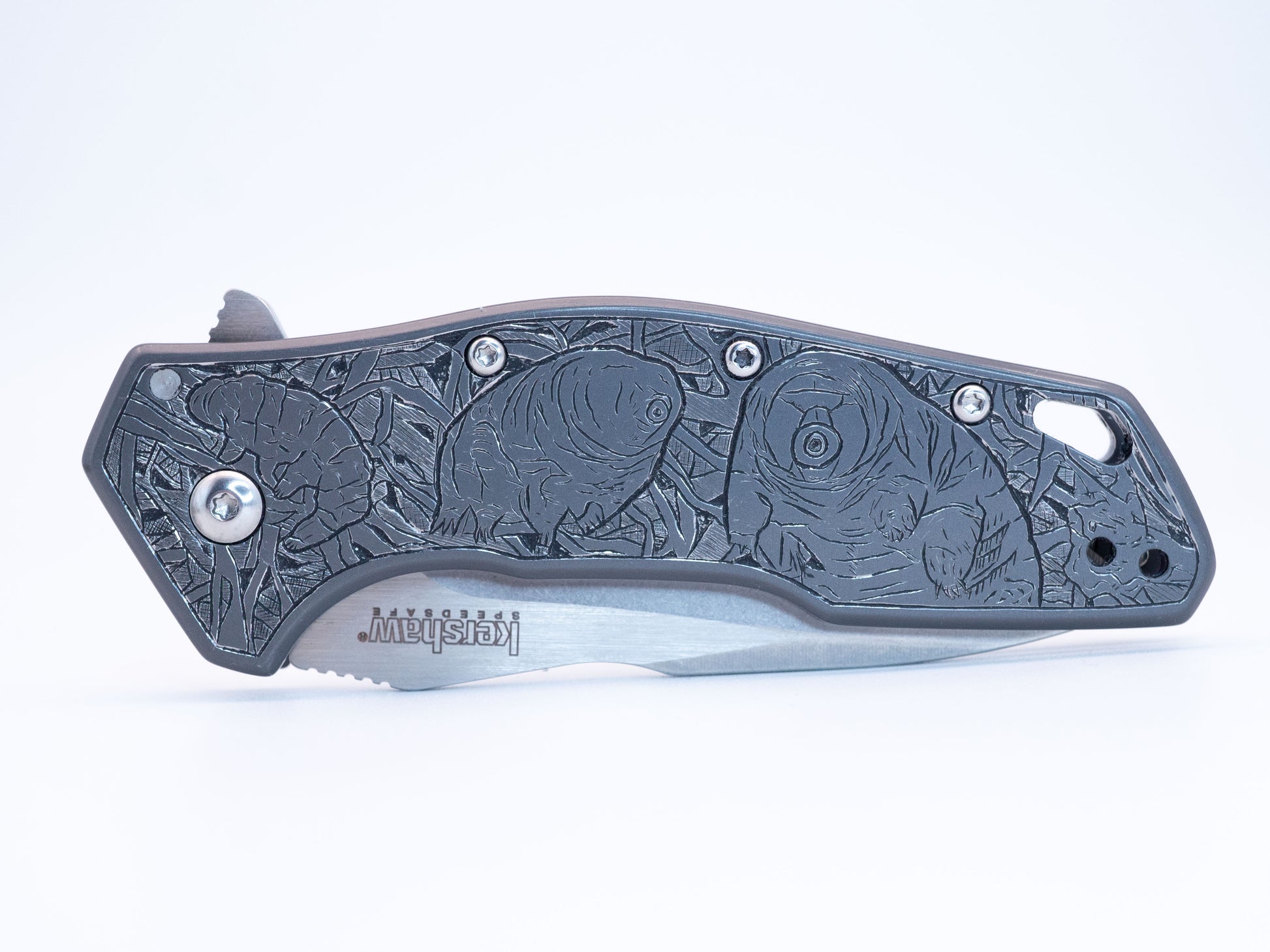 This Kershaw Eris features a beautiful hand engraved design of three tardigrades. The perfect gift for someone that appreciates the tiny biological wonder of these micro-animals.