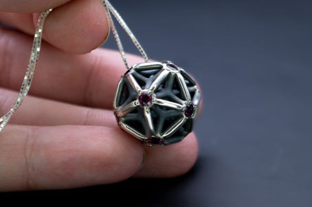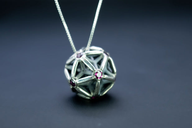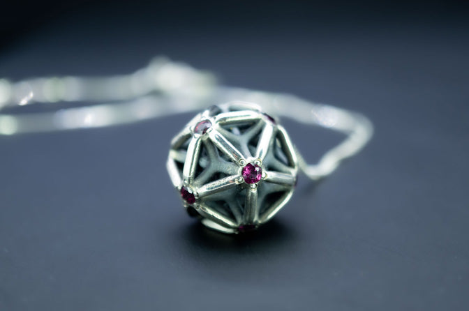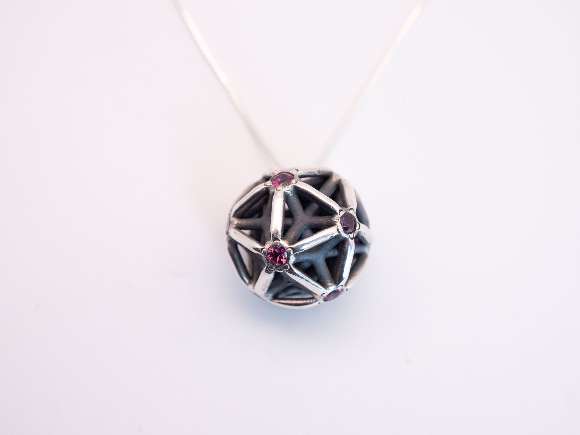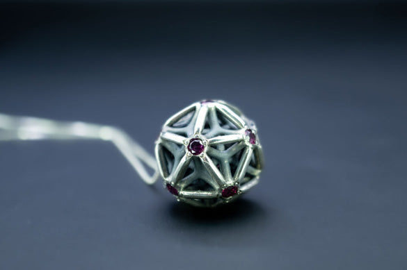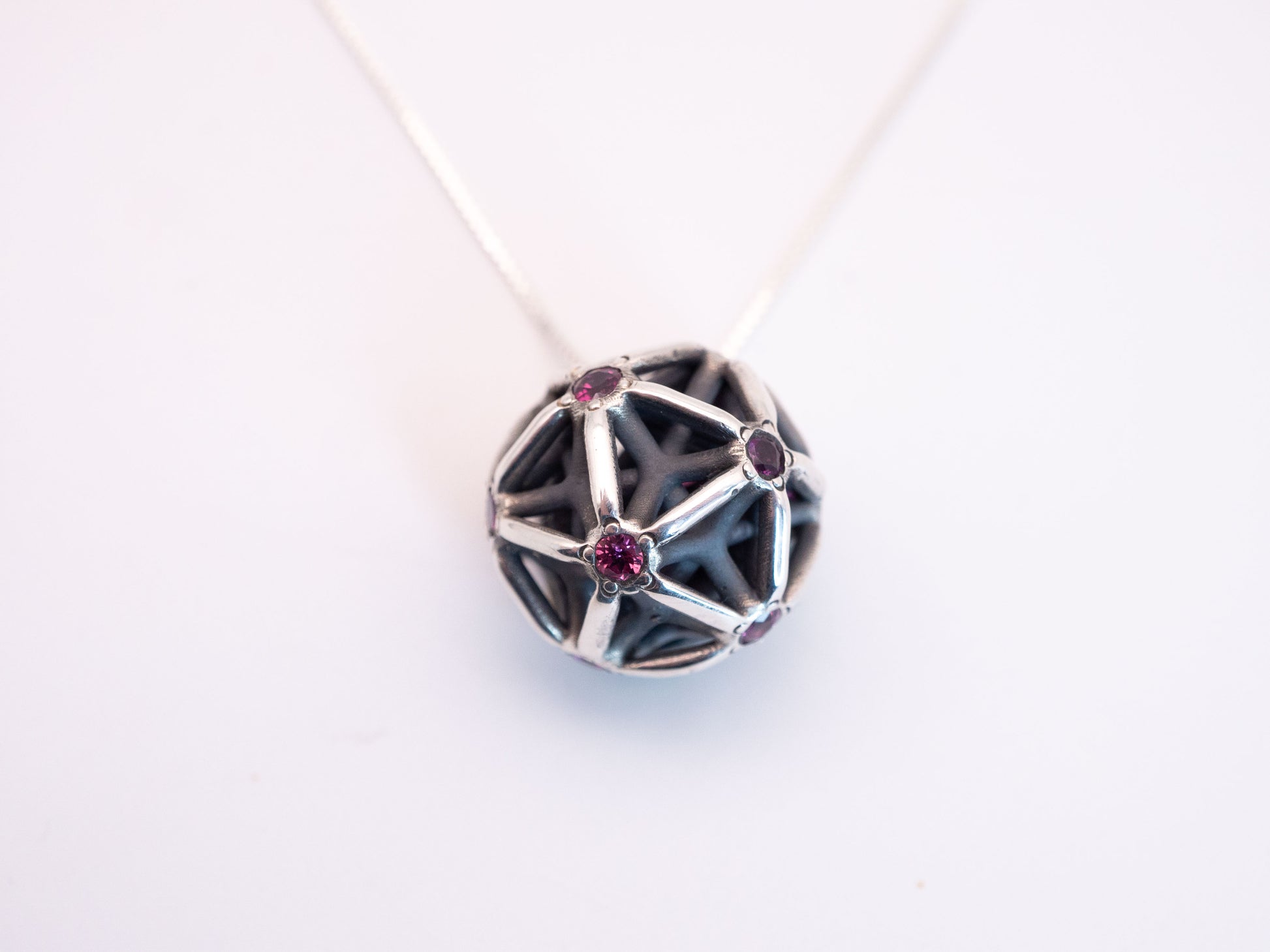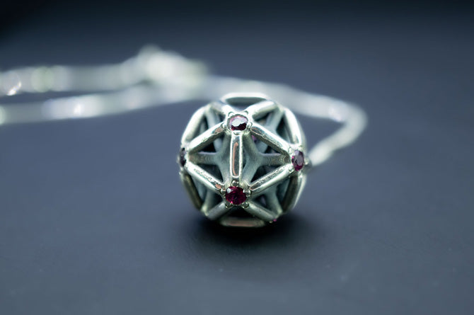 Solid Silver with Rhodolite Garnet. This pendant invites you to search deep within for the beauty and truth that reside in all of us. The intricate details and brilliant gemstones on this pendant are a wonderful meditation aid.
