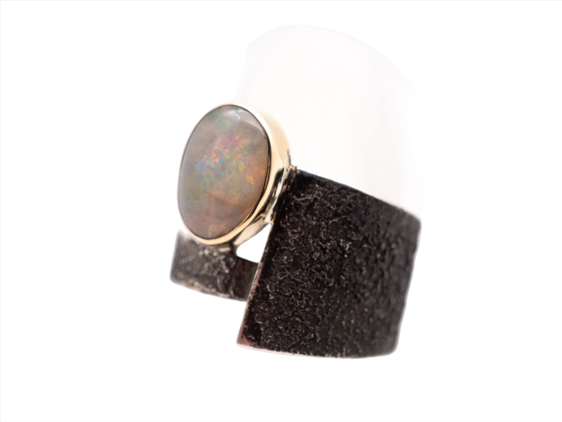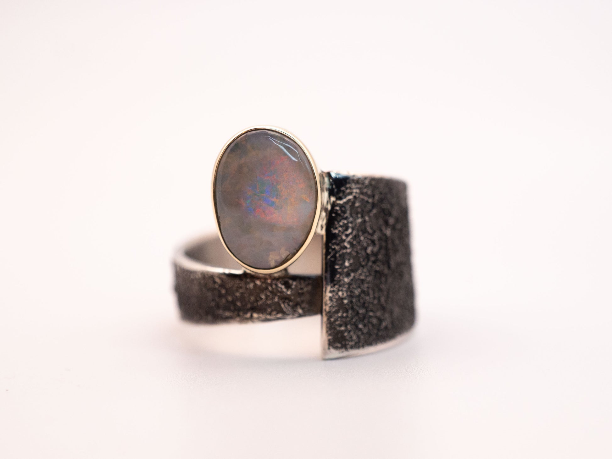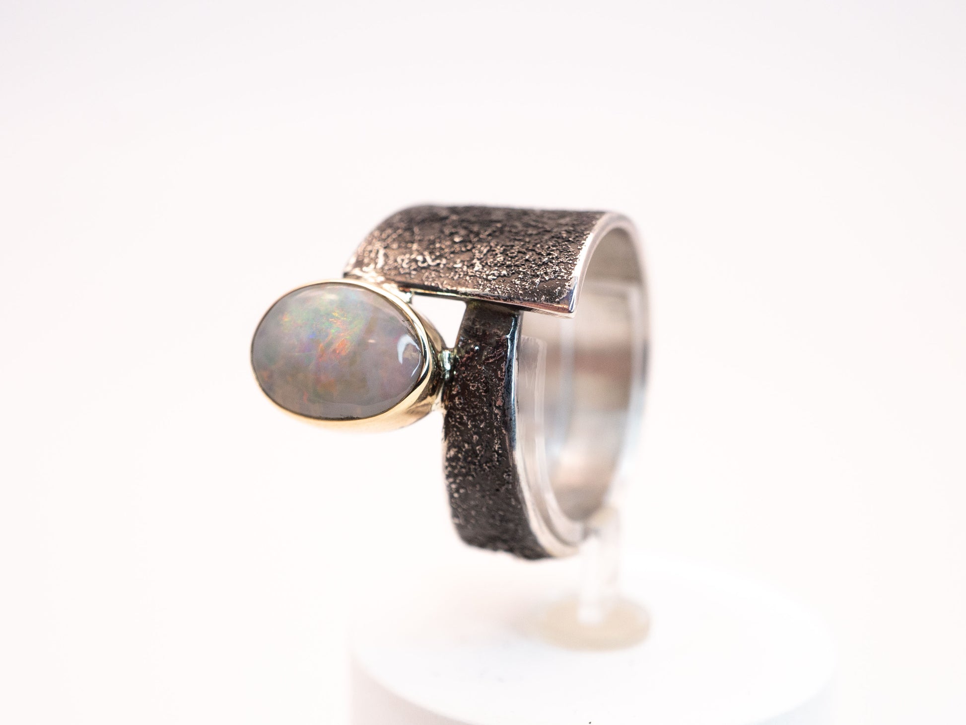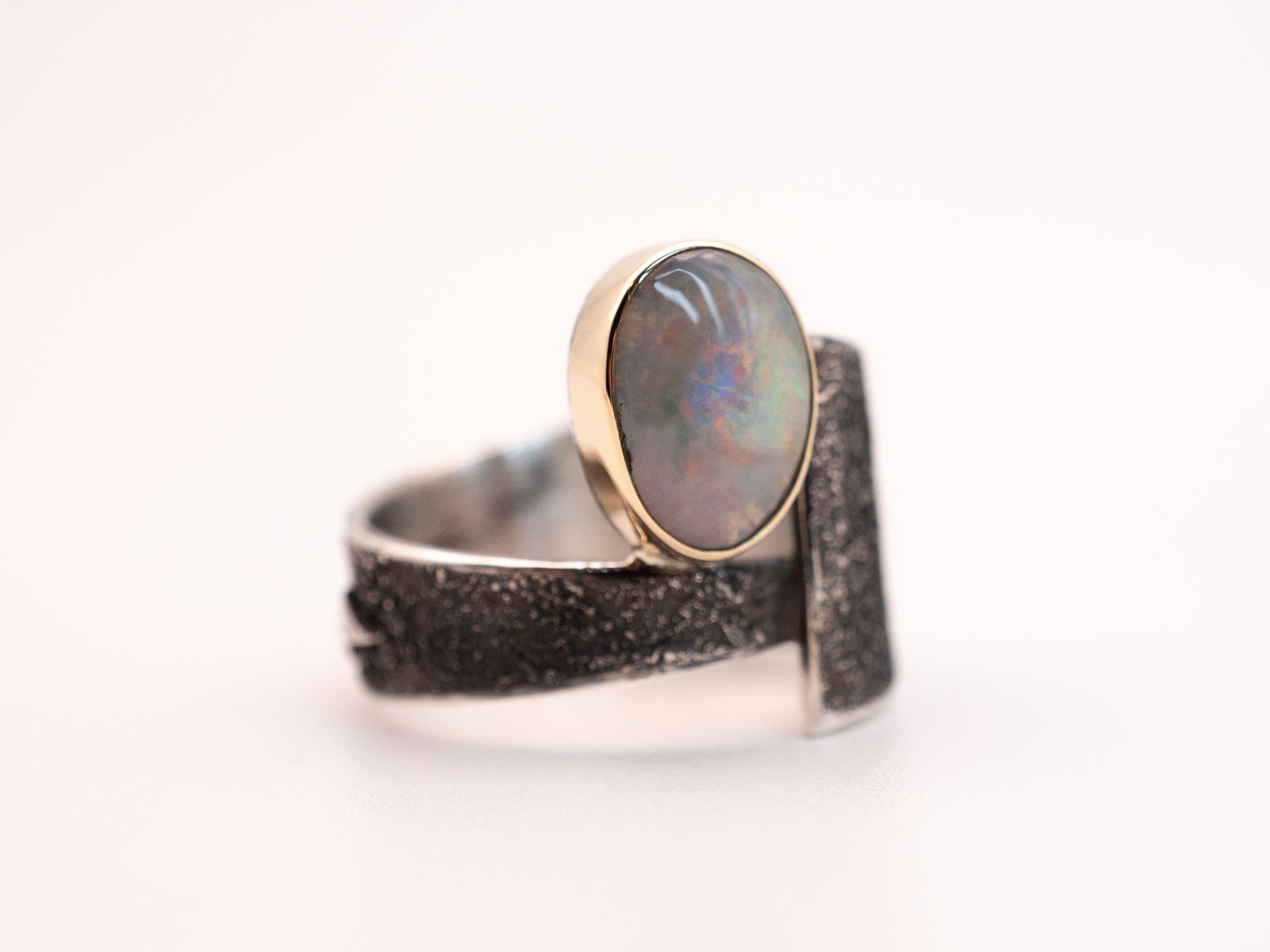 This lovely solid opal shines will brilliant red fire, a rare color in lightning ridge opals. Opal is an excellent stone to help you focus your power and bring about ideal circumstances. The band has a deep grounding texture and angular design, the bezel balances lightly on the band.