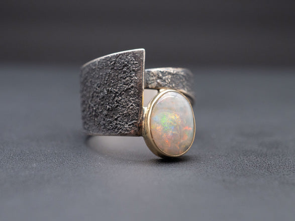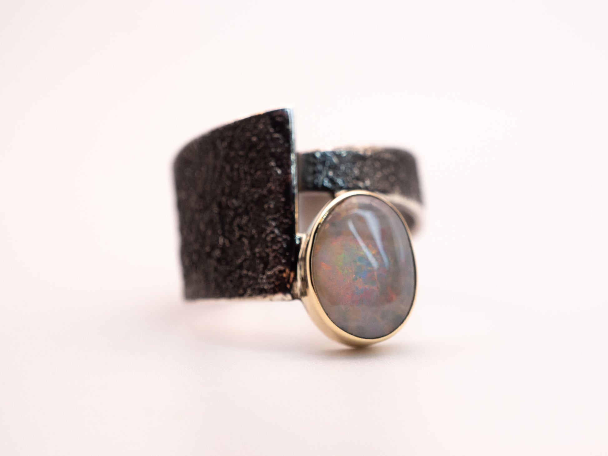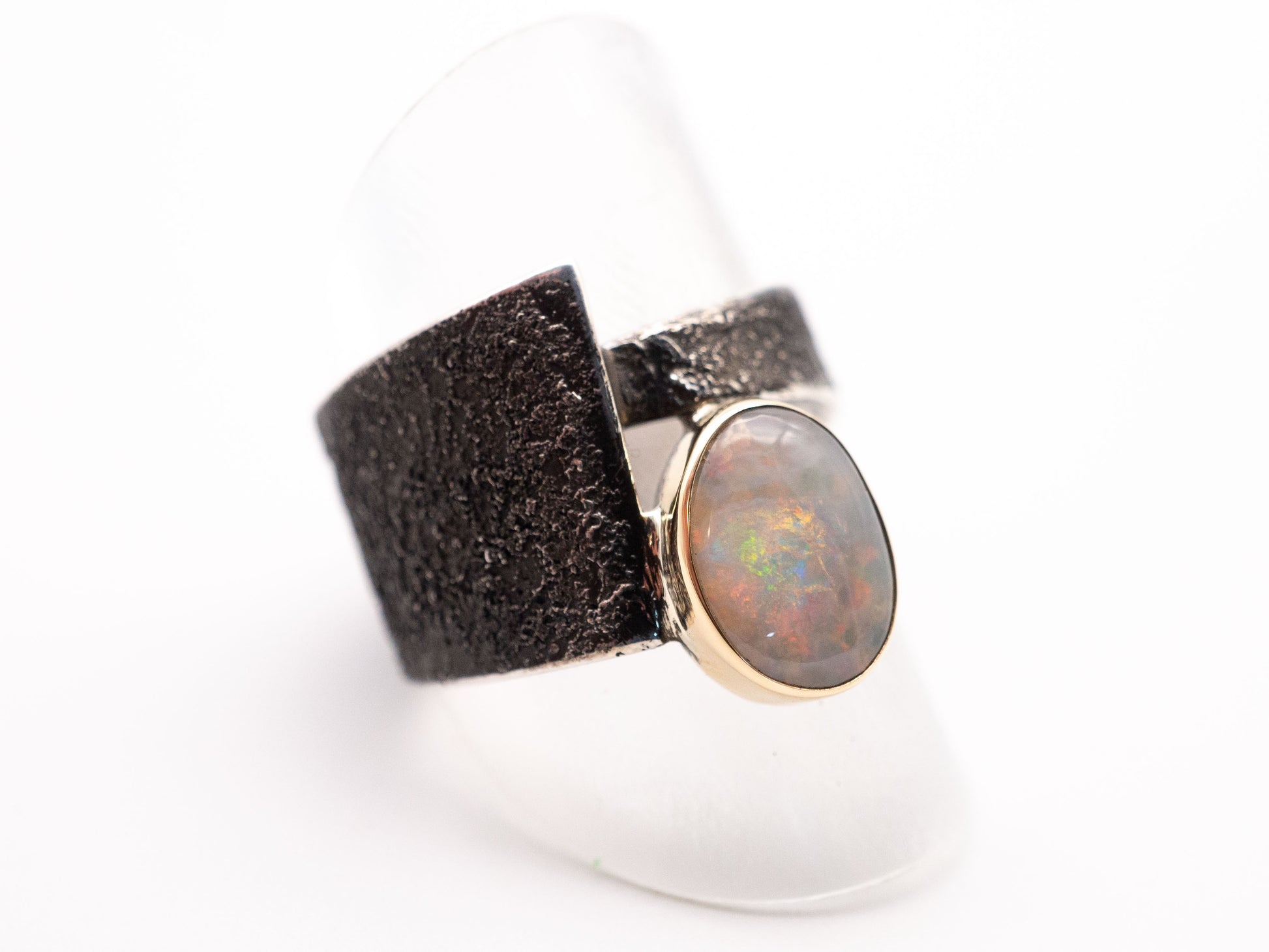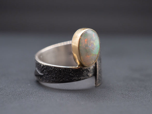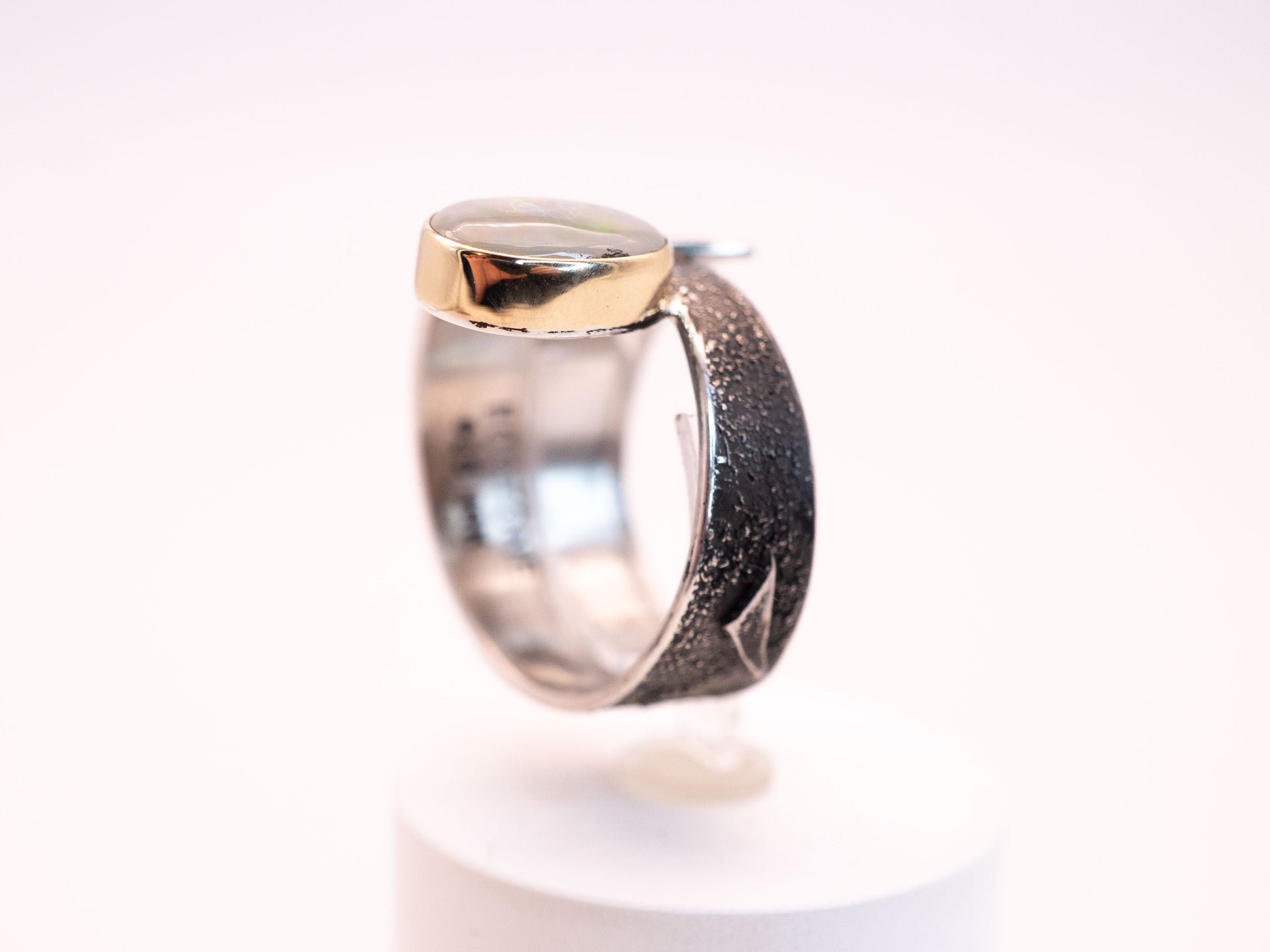 This lovely solid opal shines will brilliant red fire, a rare color in lightning ridge opals. Opal is an excellent stone to help you focus your power and bring about ideal circumstances. The band has a deep grounding texture and angular design, the bezel balances lightly on the band.