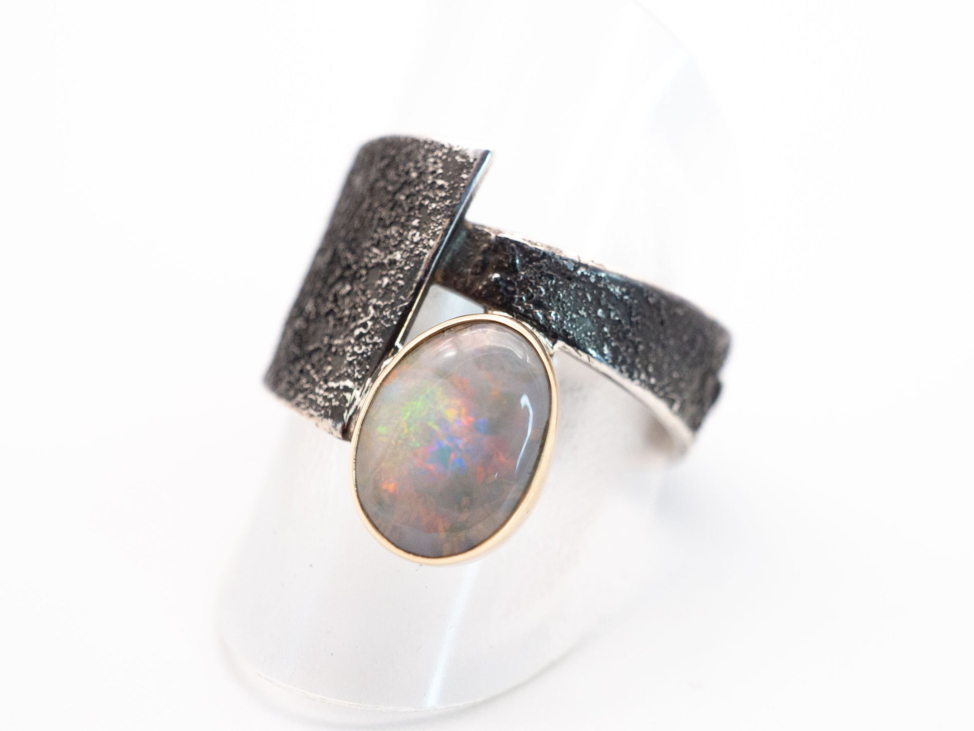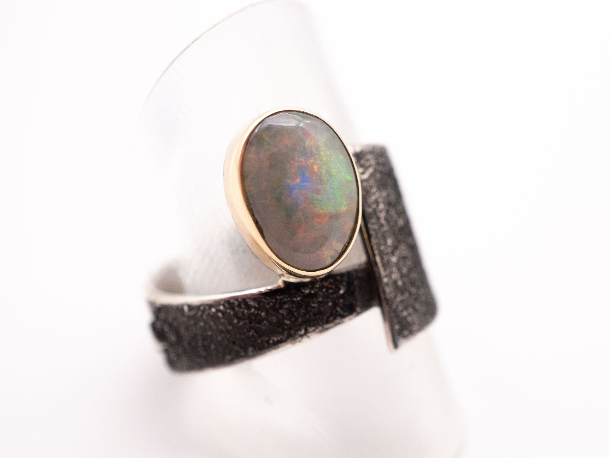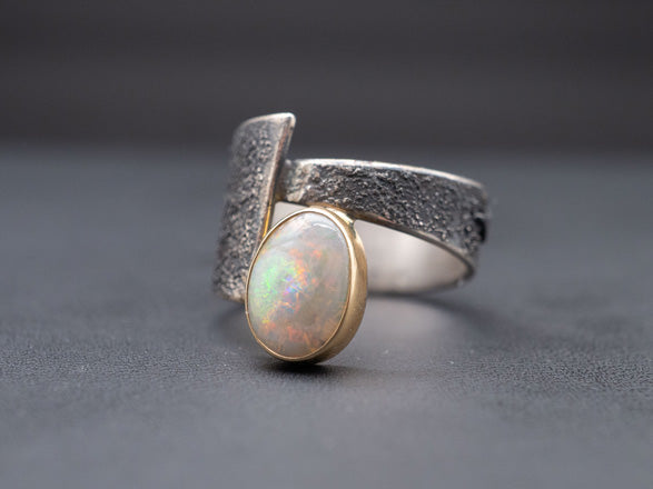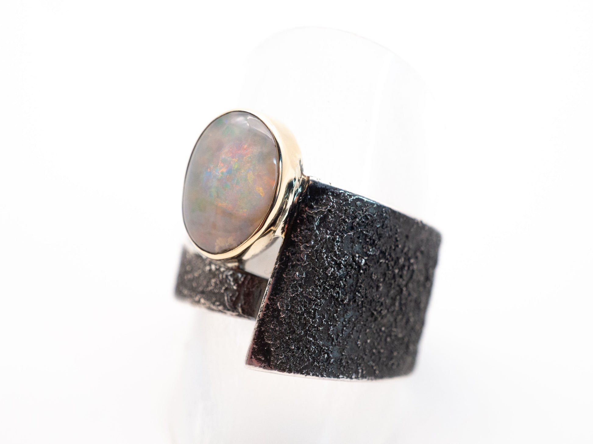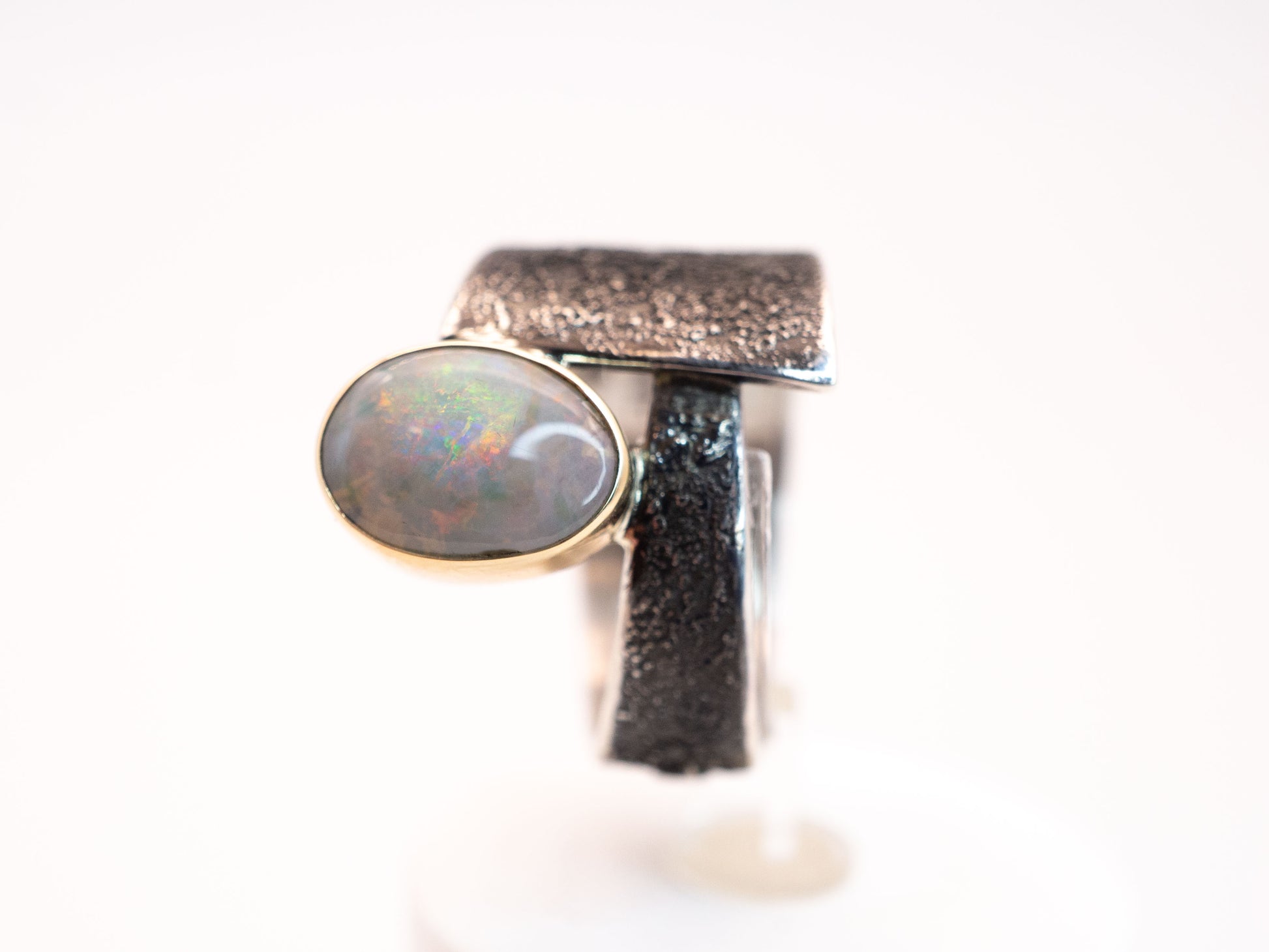 This lovely solid opal shines will brilliant red fire, a rare color in lightning ridge opals. Opal is an excellent stone to help you focus your power and bring about ideal circumstances. The band has a deep grounding texture and angular design, the bezel balances lightly on the band.