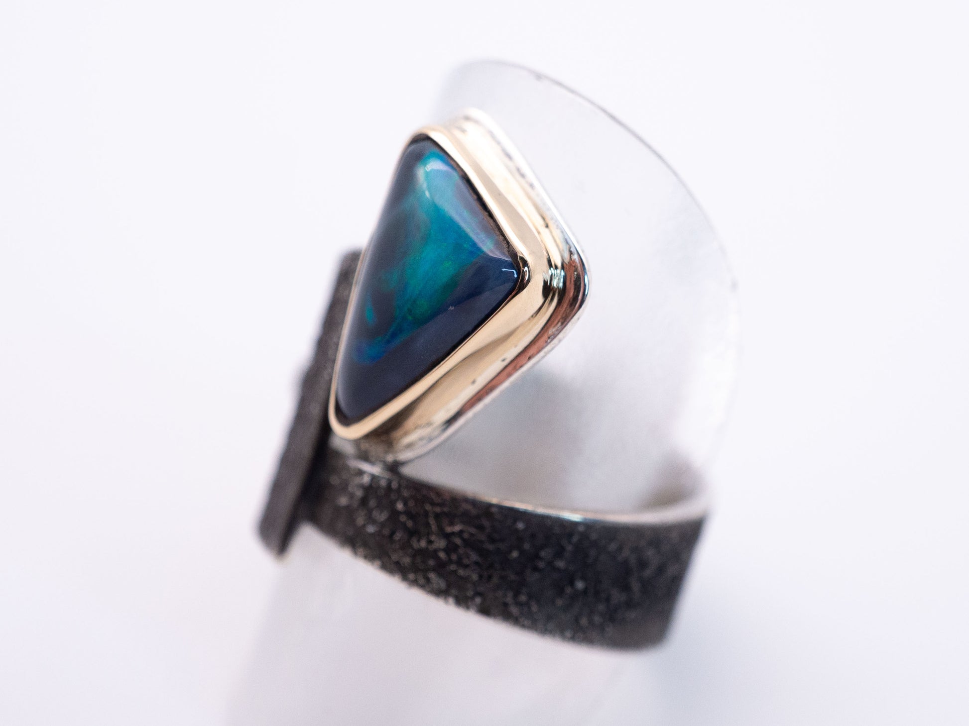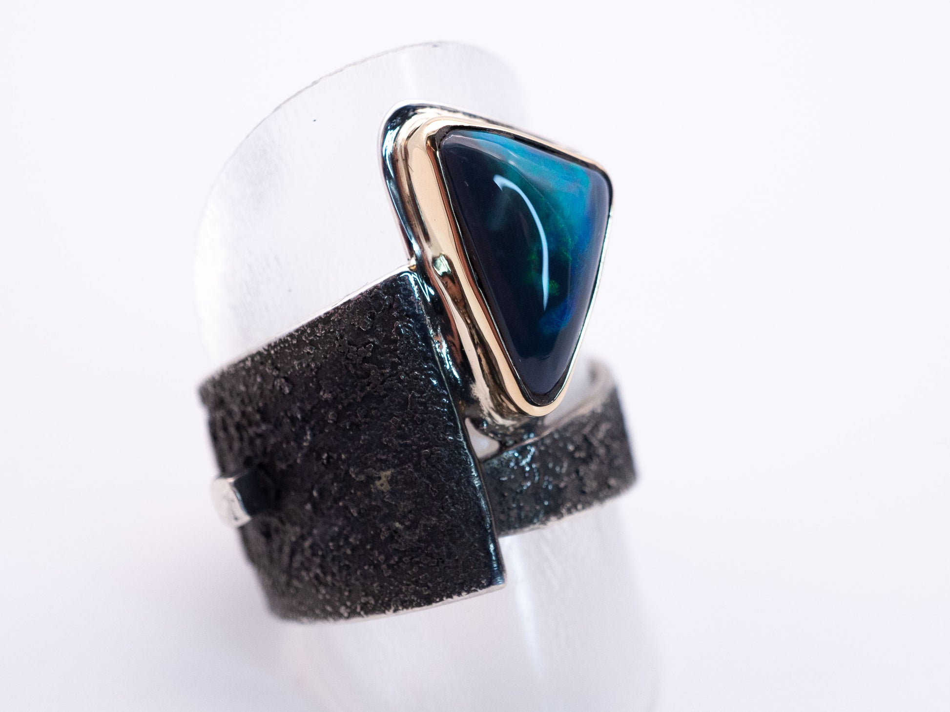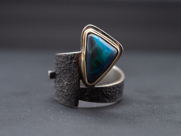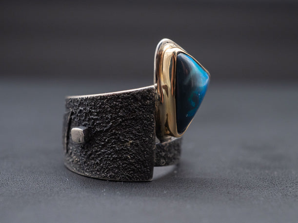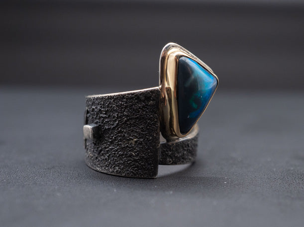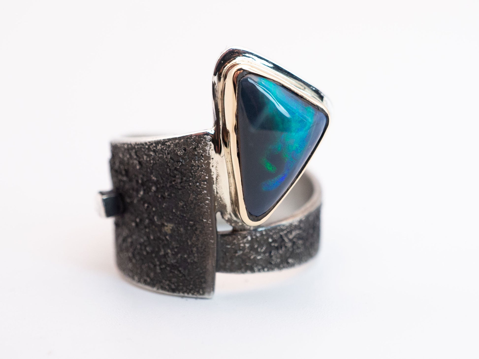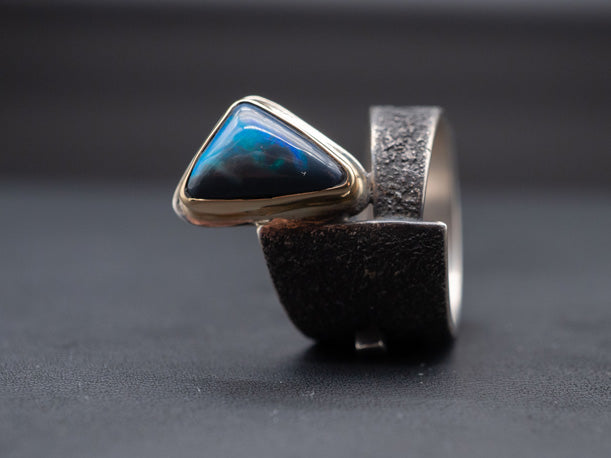 A block and an organic form sit adjacent to a river of green fire. This sculptural ring features a solid Lightning Ridge opal we cut in house, set in 14k yellow gold. The band is hand fabricated in .925 silver.