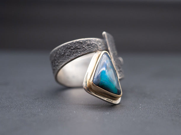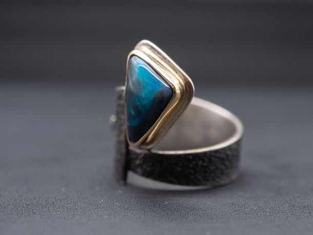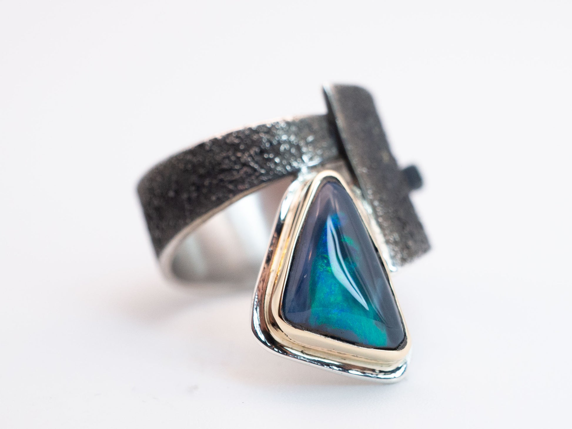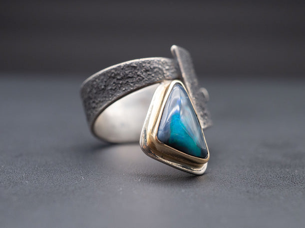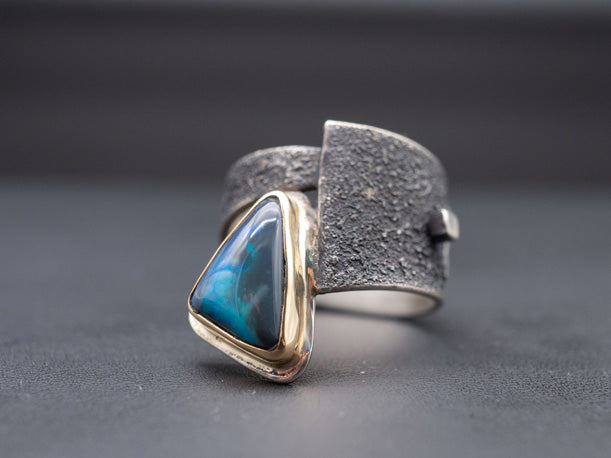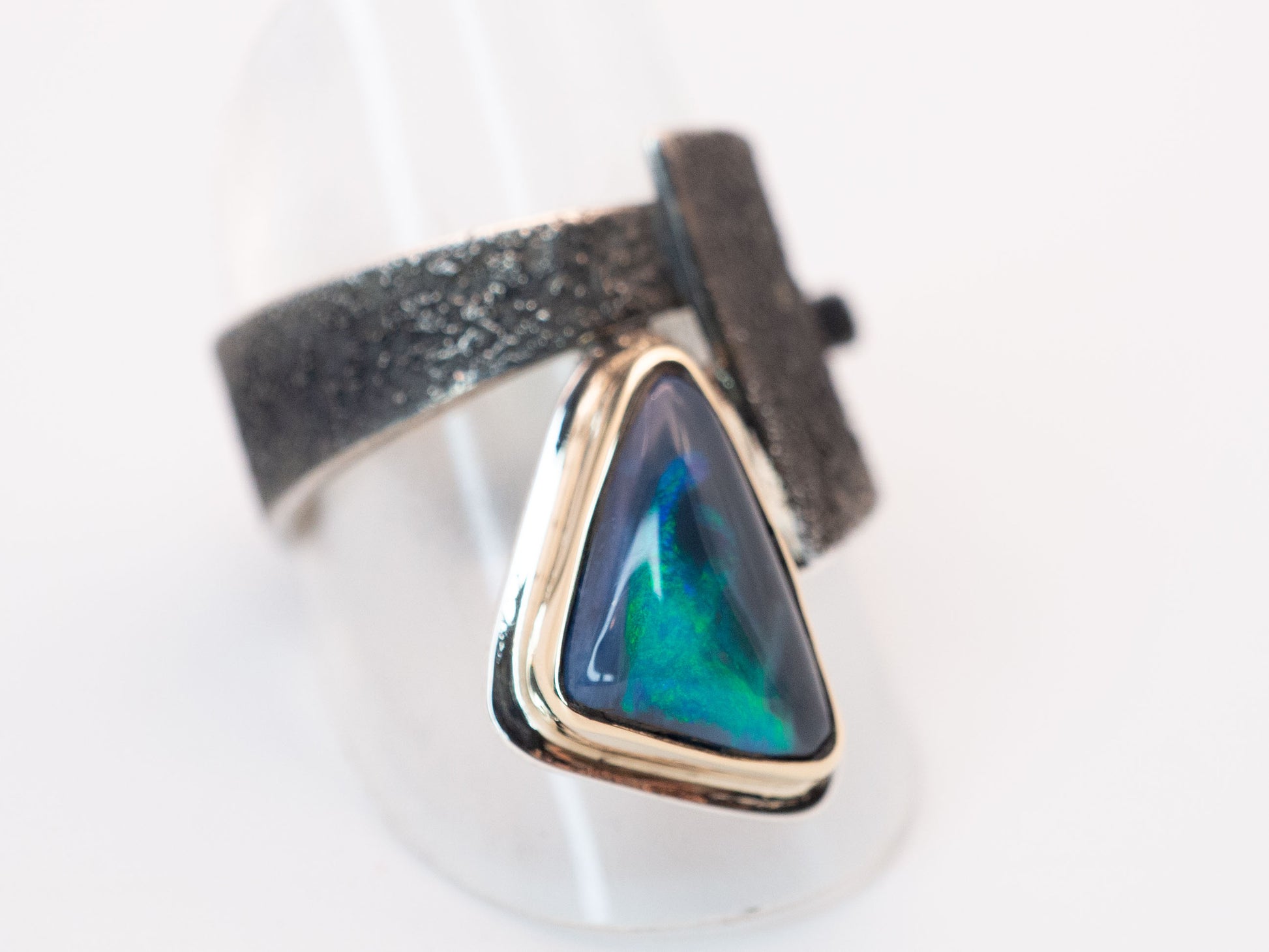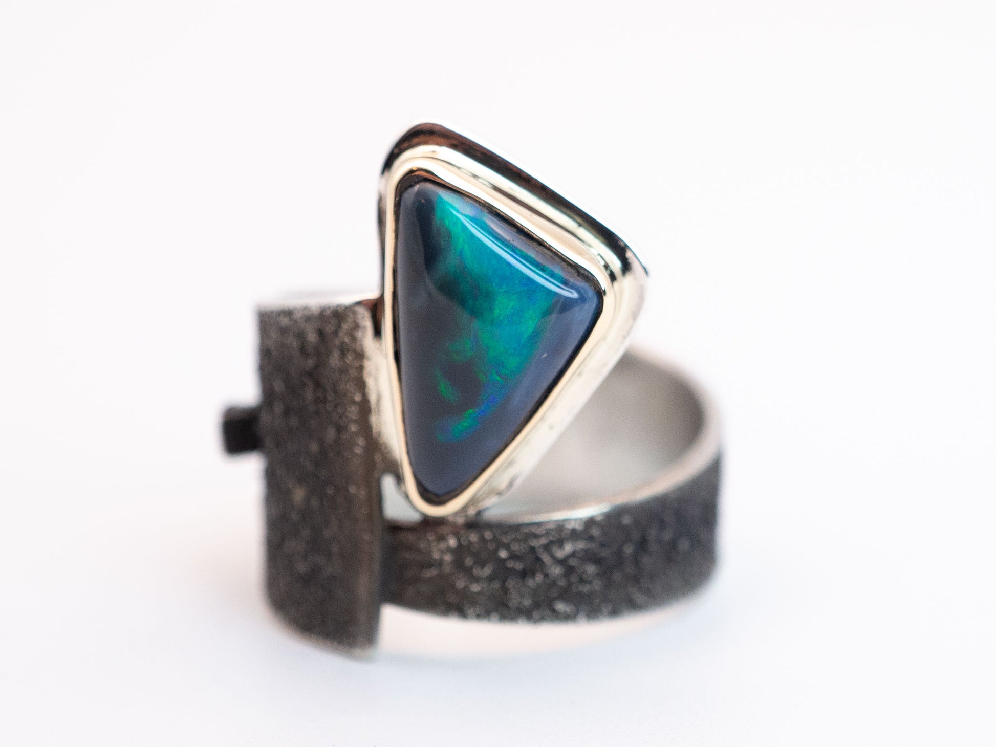 A block and an organic form sit adjacent to a river of green fire. This sculptural ring features a solid Lightning Ridge opal we cut in house, set in 14k yellow gold. The band is hand fabricated in .925 silver.