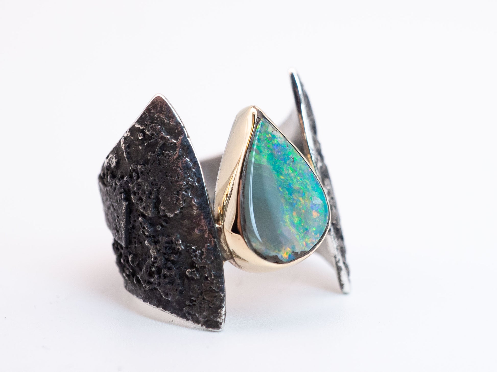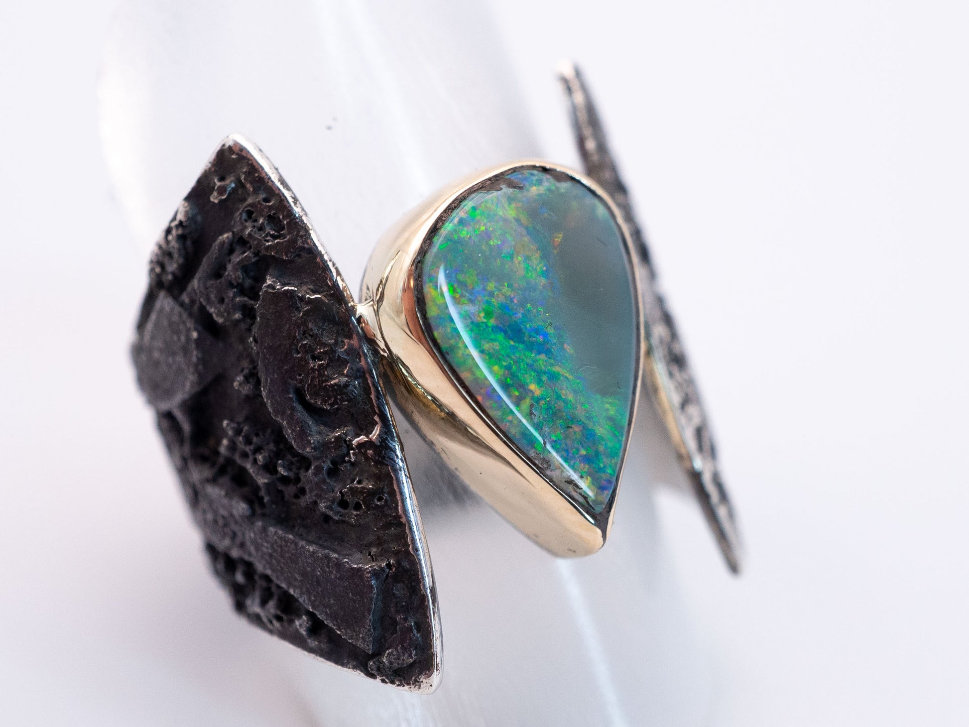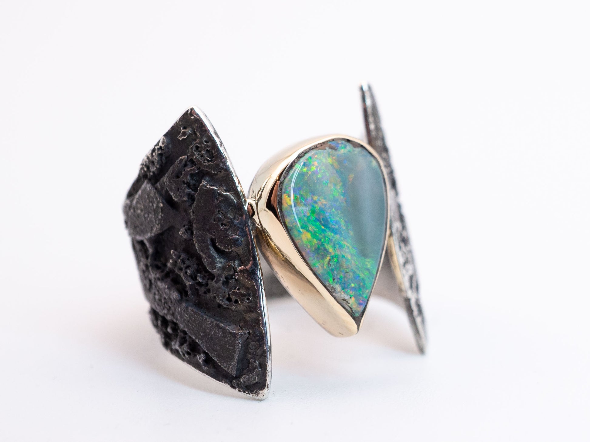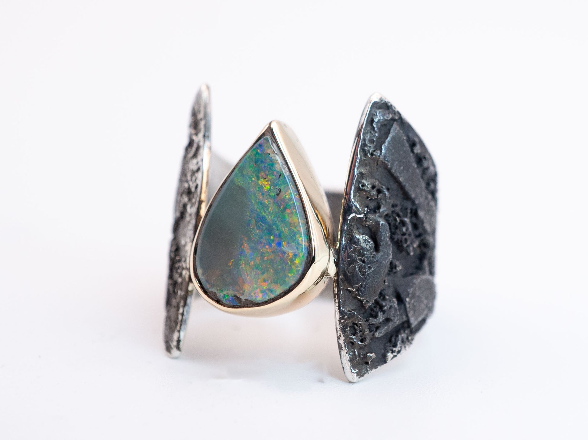 A rocky organic texture cradles a teardrop of brilliant rainbow fire. This sculptural ring features a Lightning Ridge opal doublet we cut in house, set in 14k yellow gold. The band is hand fabricated in .925 silver.