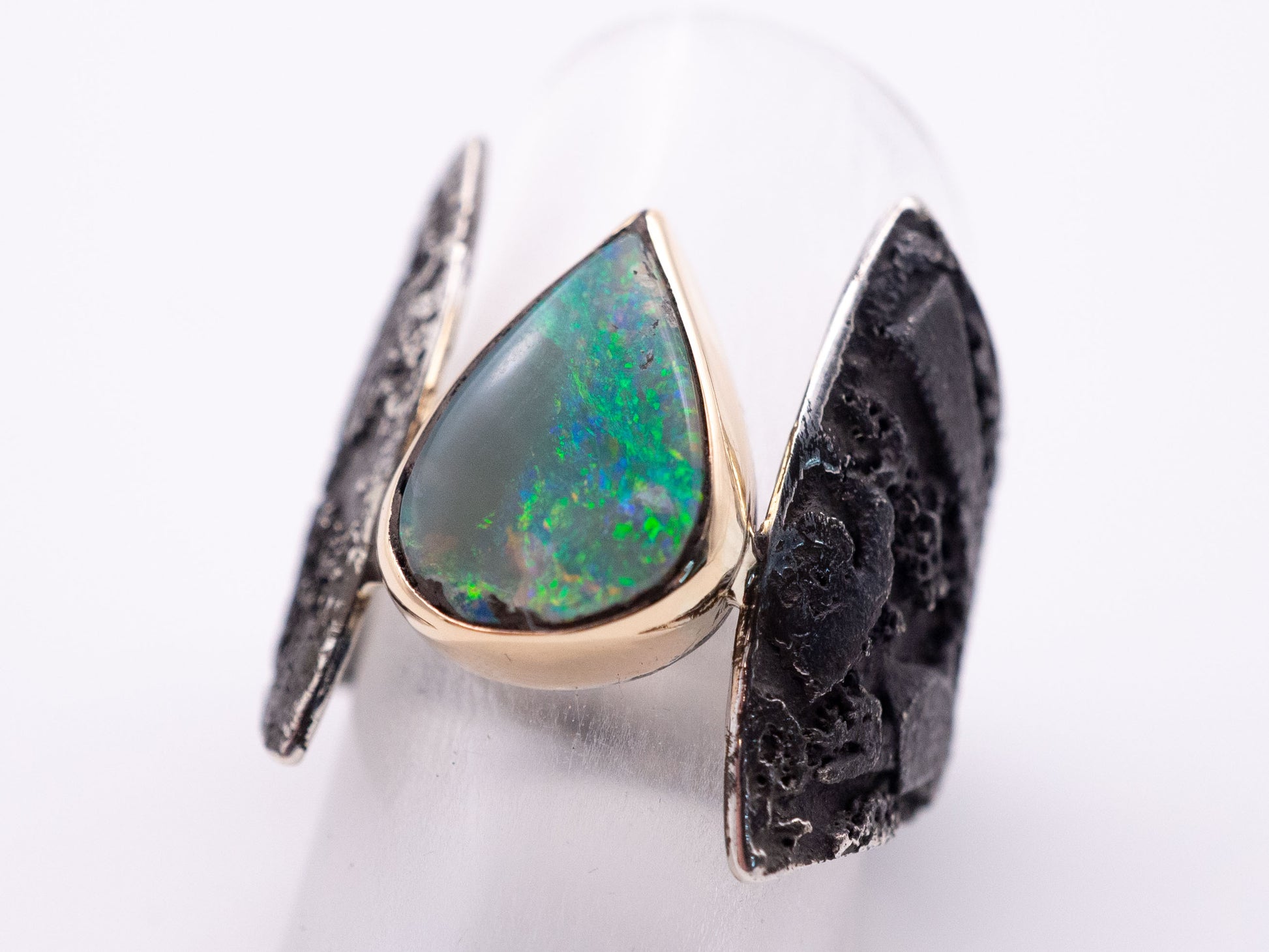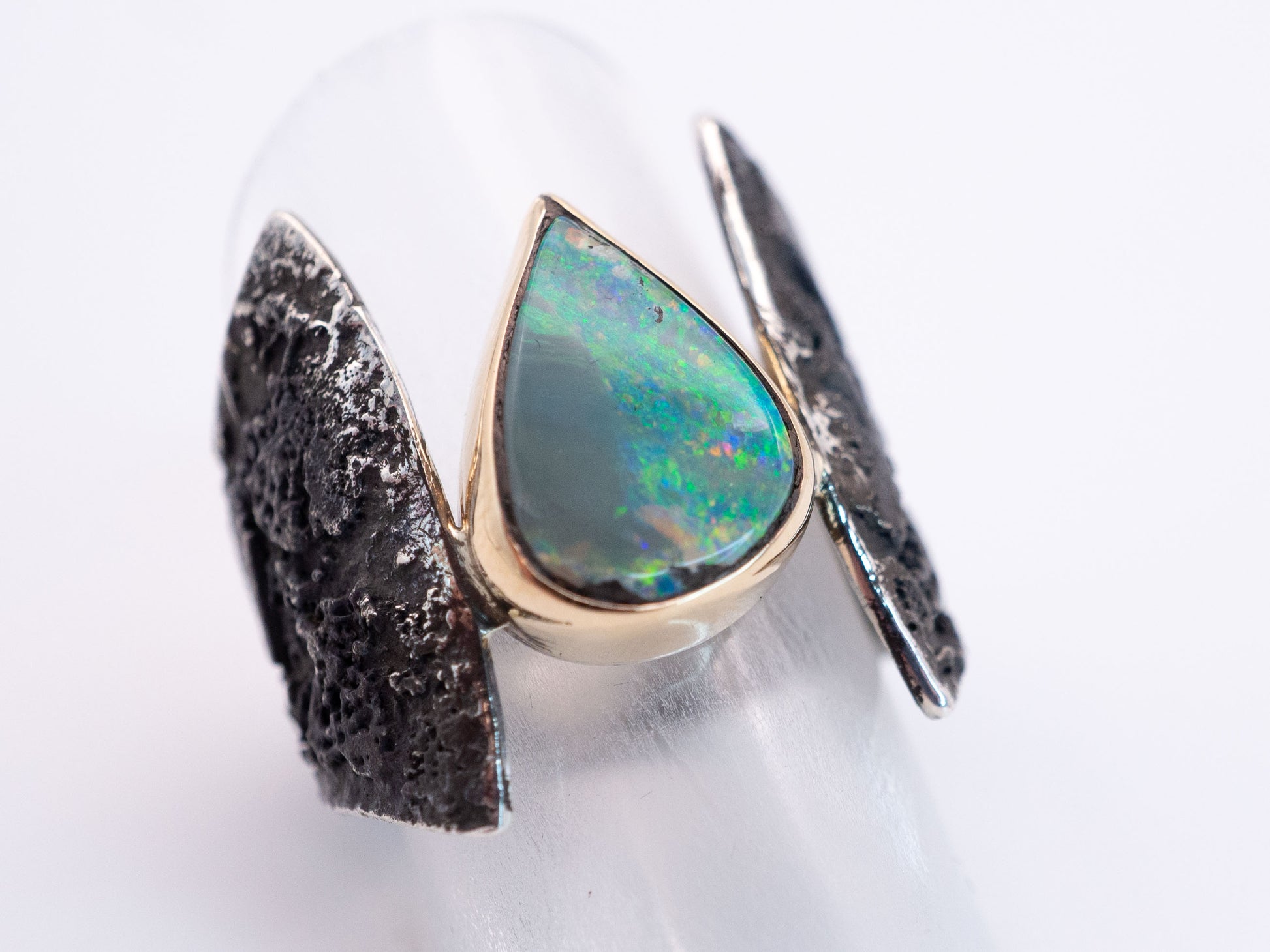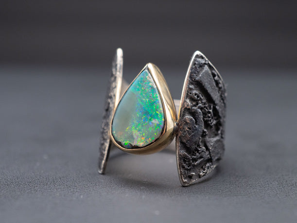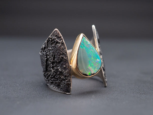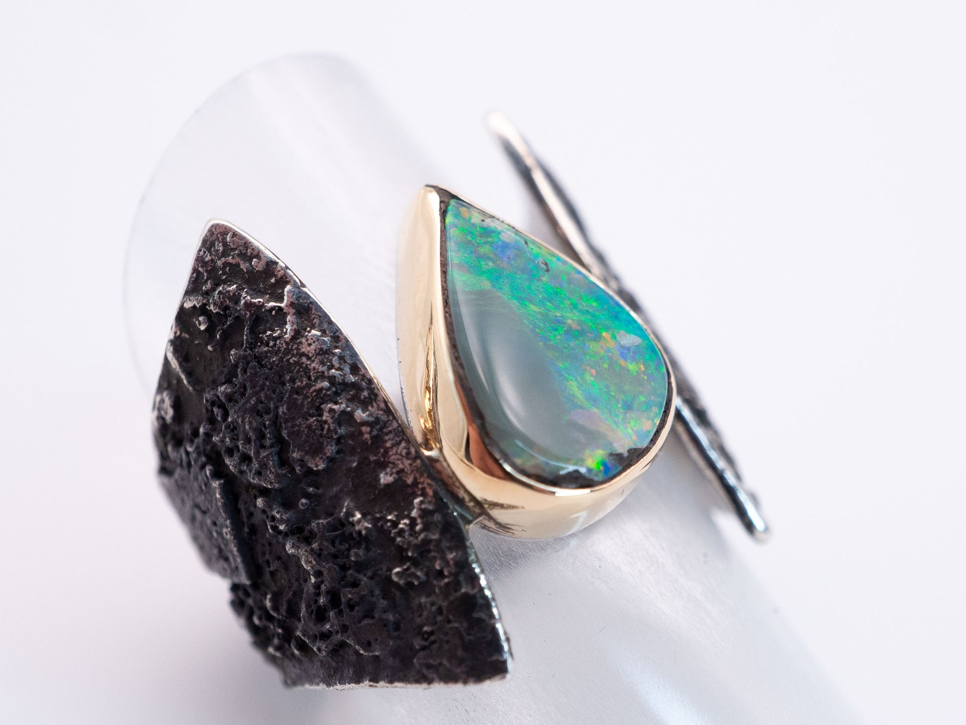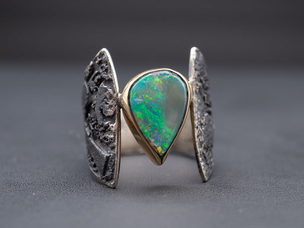 A rocky organic texture cradles a teardrop of brilliant rainbow fire. This sculptural ring features a Lightning Ridge opal doublet we cut in house, set in 14k yellow gold. The band is hand fabricated in .925 silver.