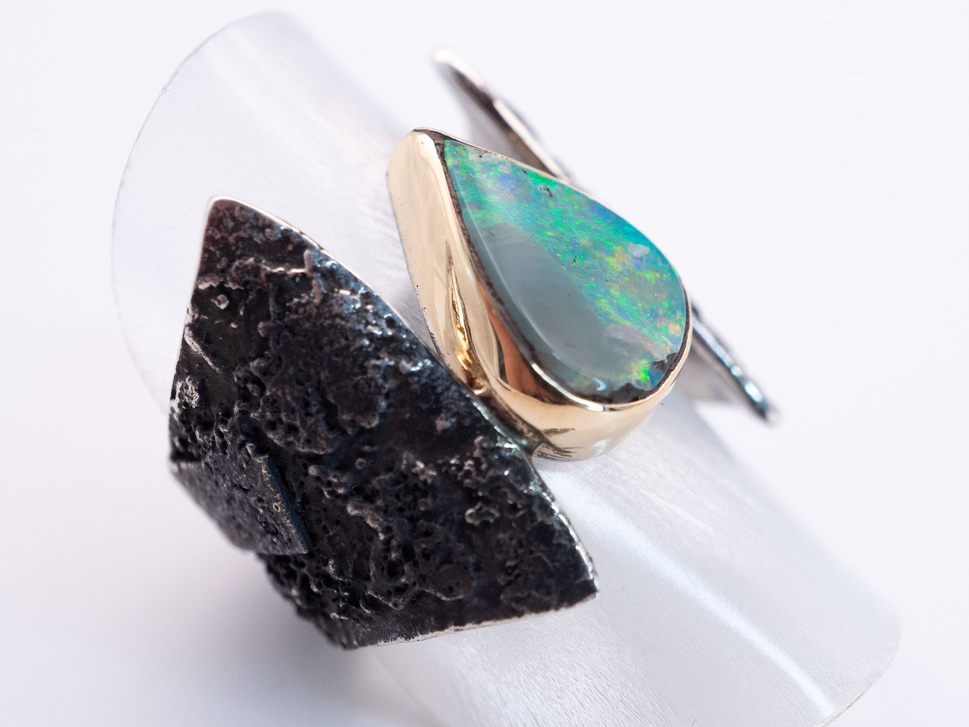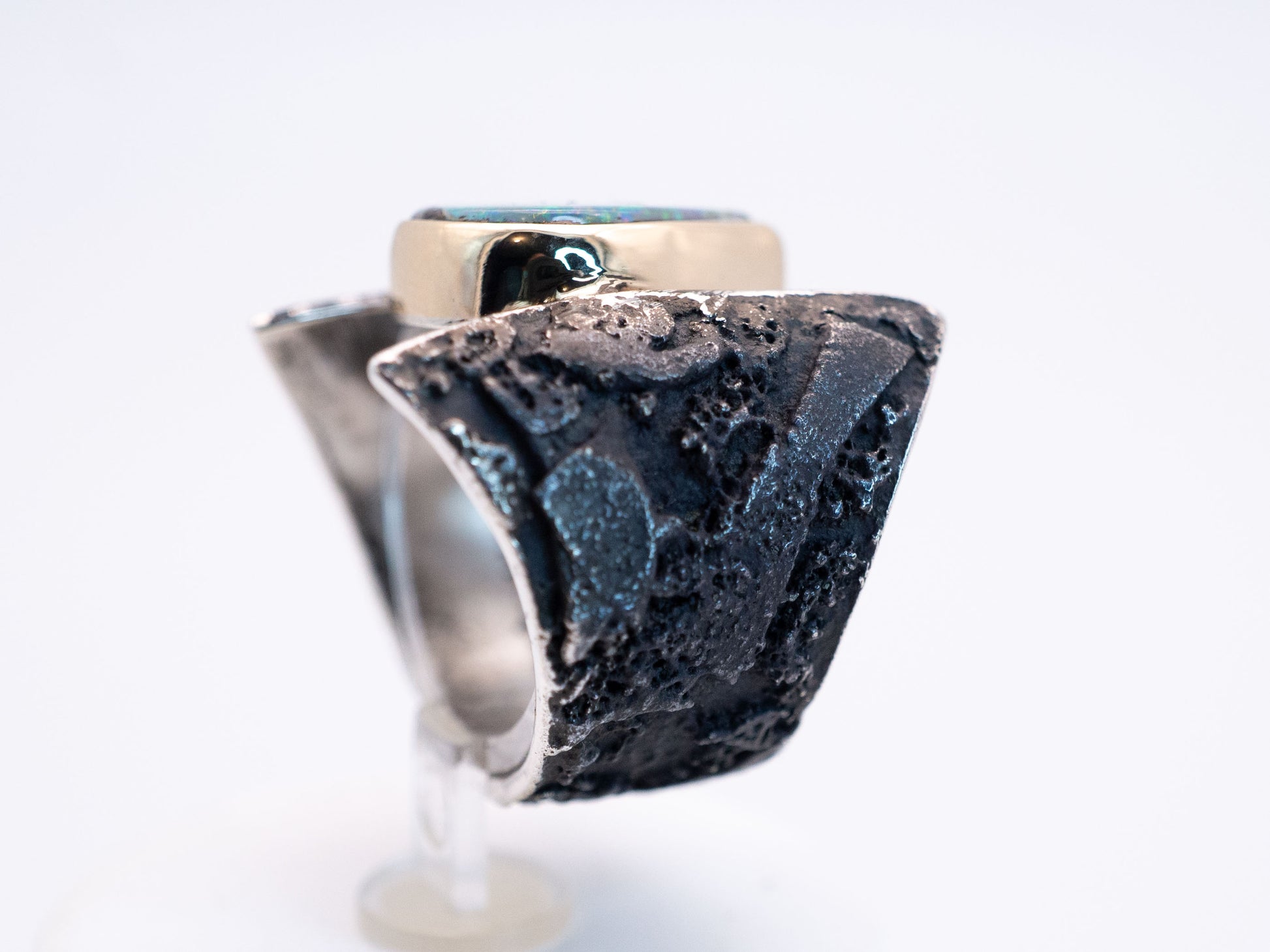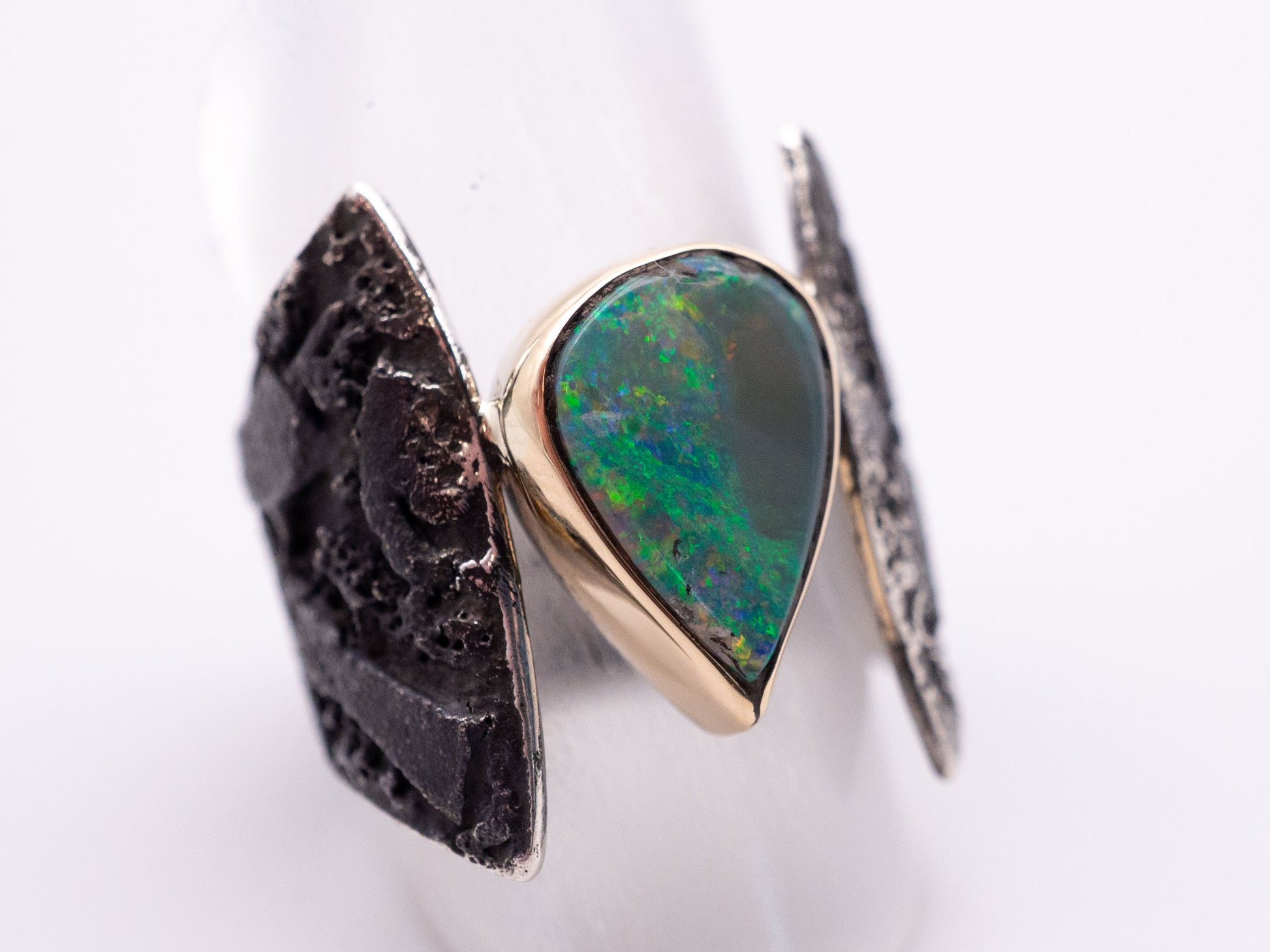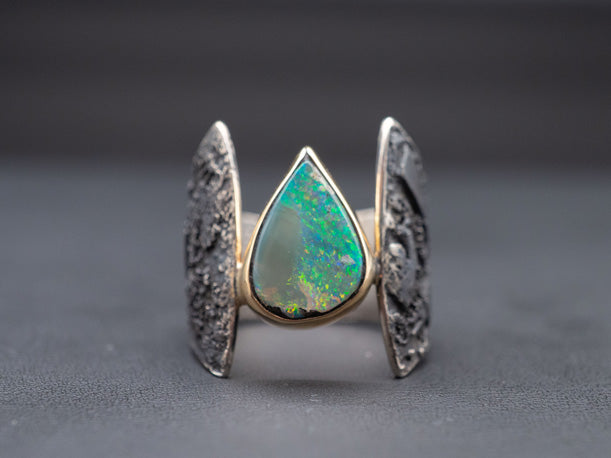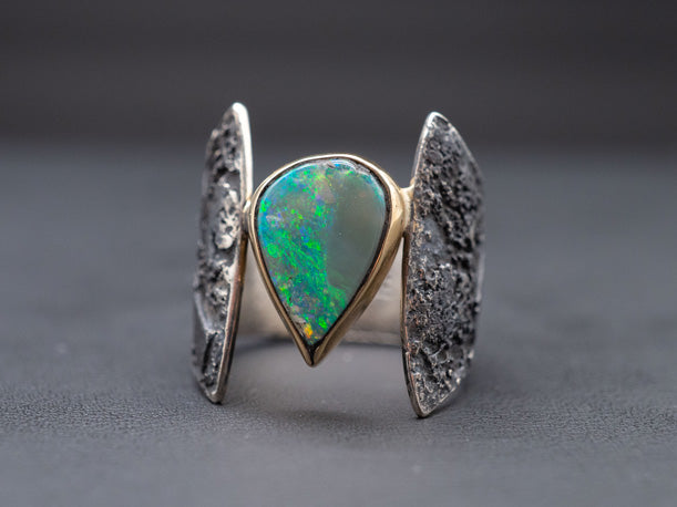 A rocky organic texture cradles a teardrop of brilliant rainbow fire. This sculptural ring features a Lightning Ridge opal doublet we cut in house, set in 14k yellow gold. The band is hand fabricated in .925 silver.