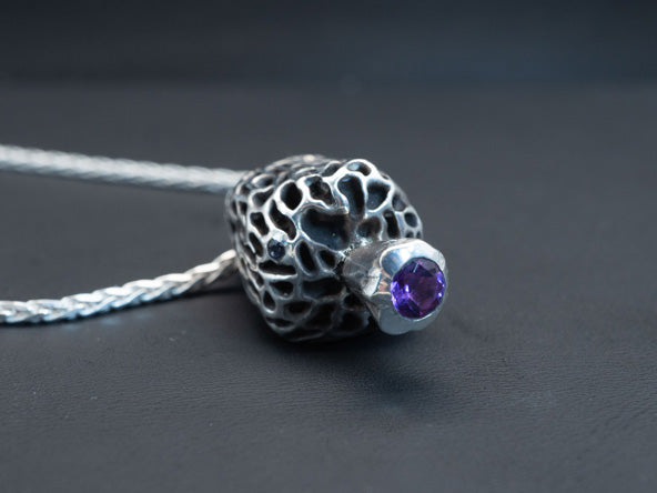 This piece is studded with the following natural gems: 8 2.5mm Montana Yogo sapphires, 3 rhodolite garnets and a 5mm amethyst hidden in the stem.