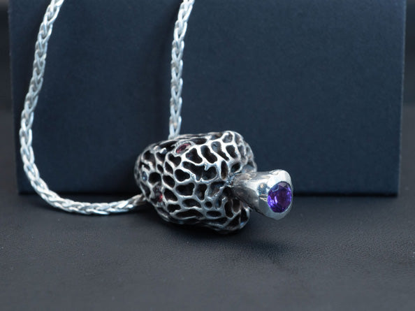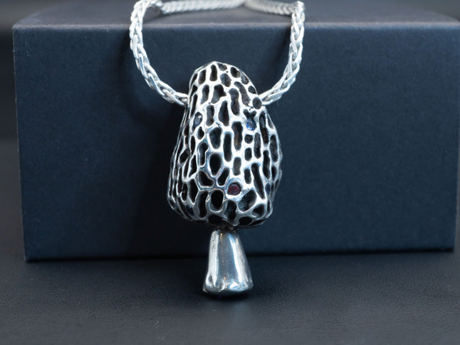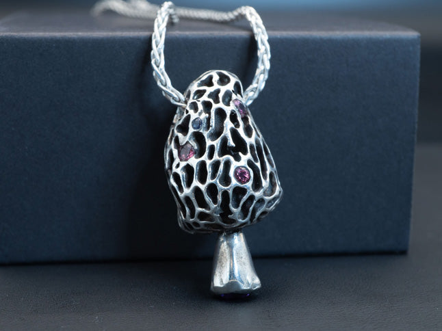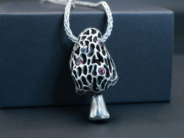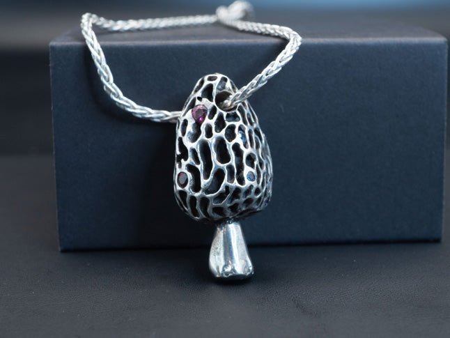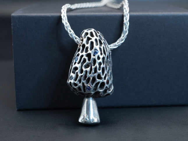 A 35mm tall, solid silver morel mushroom studded with natural gemstones. This is a very unique and interesting piece, sure to be a conversation starter or the perfect earthy compliment to your day.