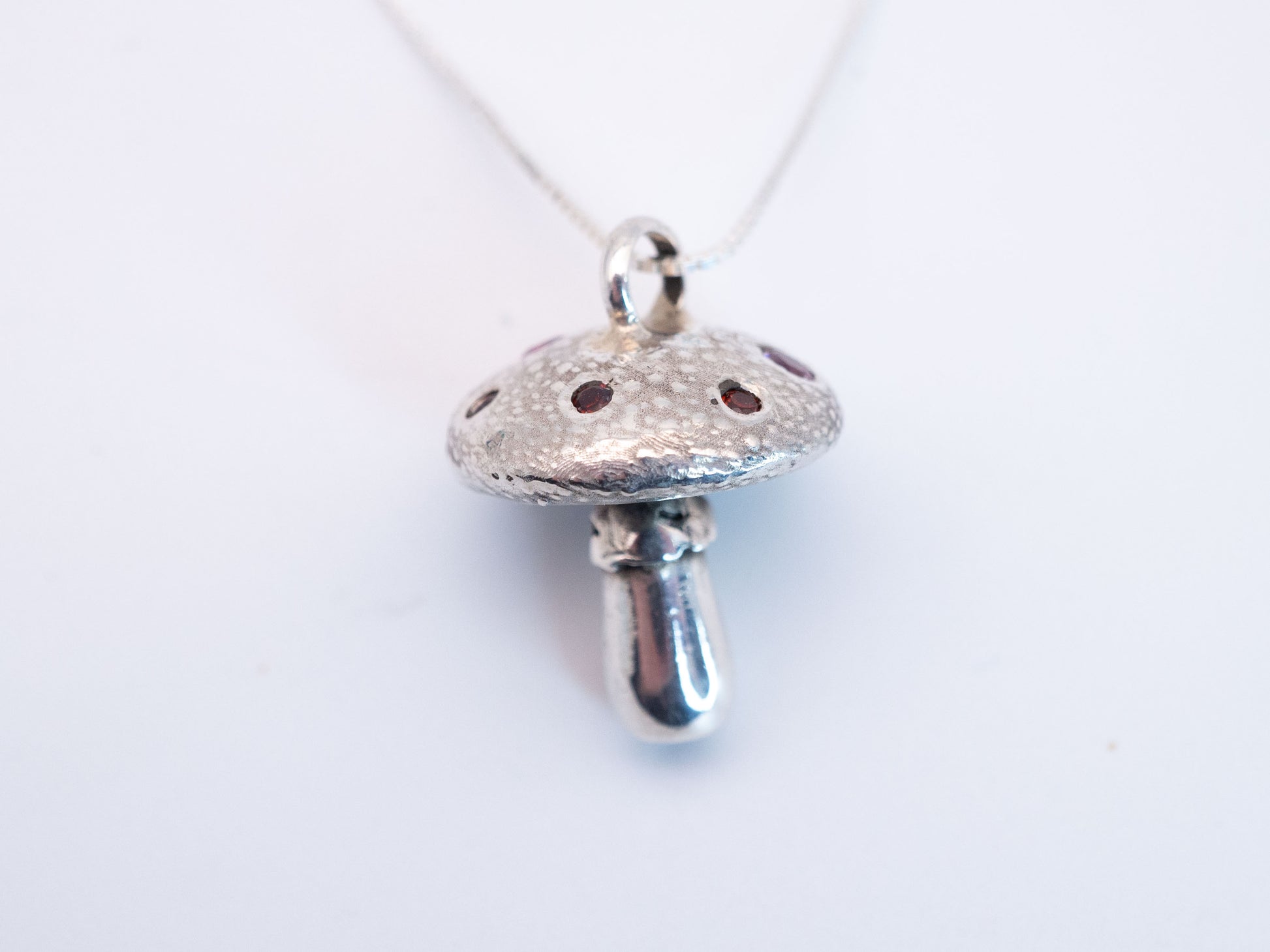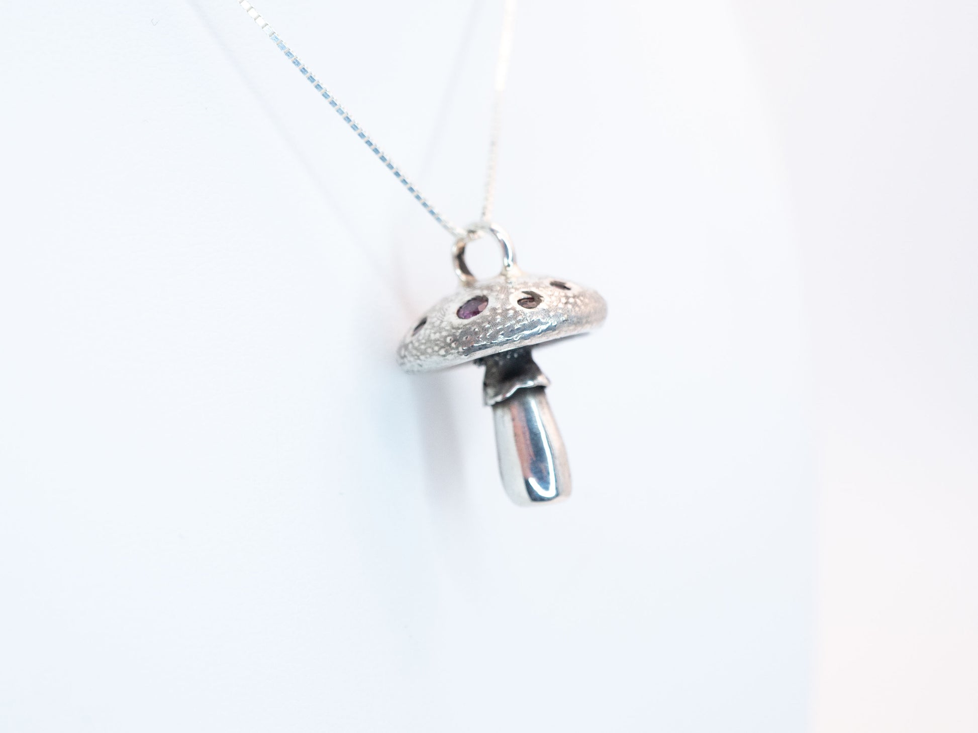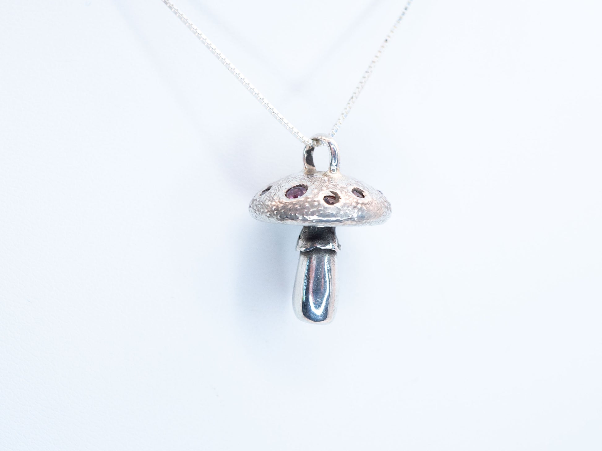 A beautiful 3D Amanita Mushroom pendant. Set with multiple Rhodolite garnets as well as a small sapphire, accented with hand engraved details. Add the beauty of nature to your day and mush love to any outfit.