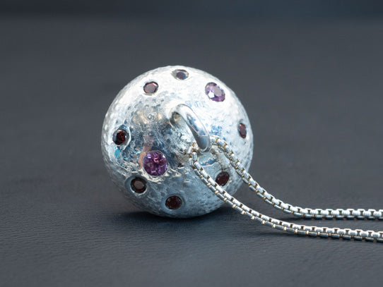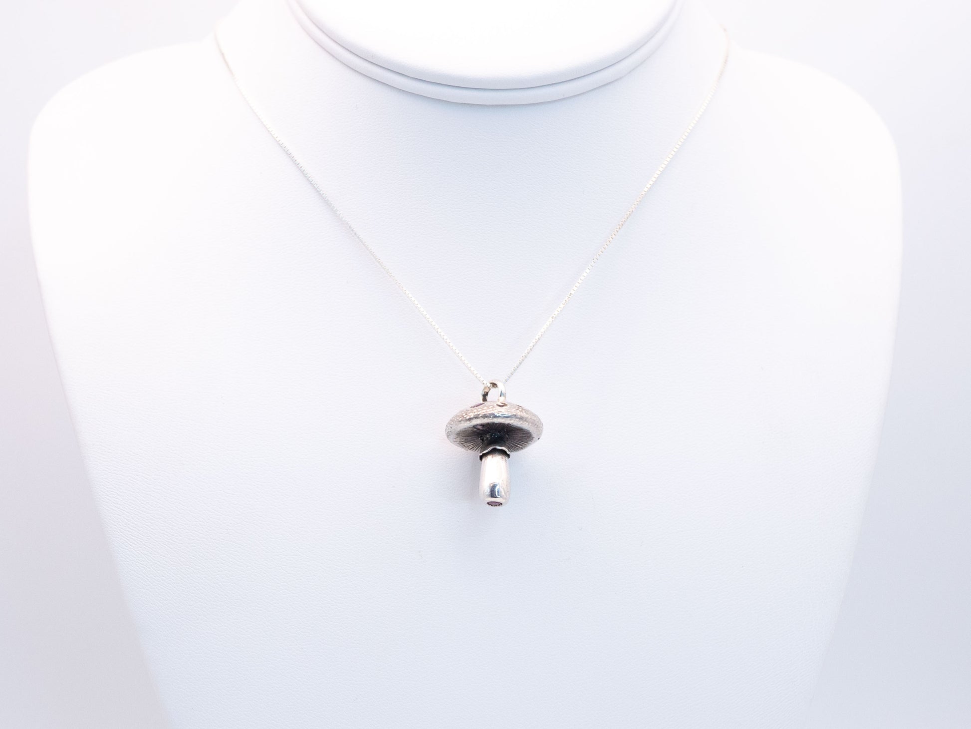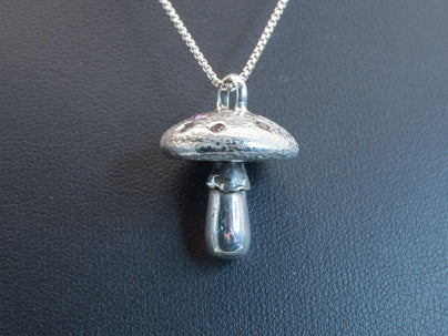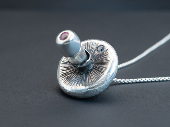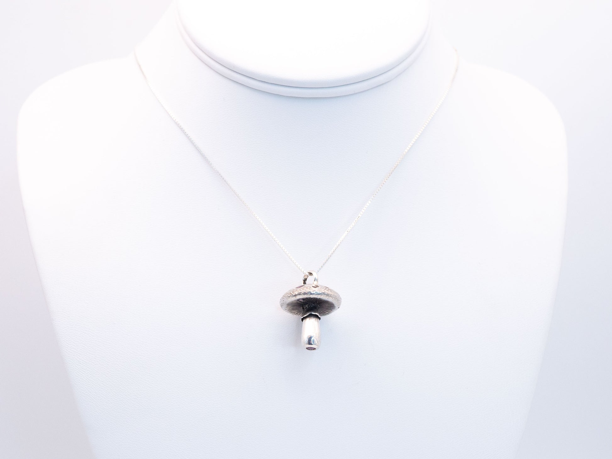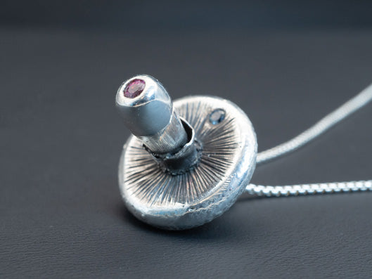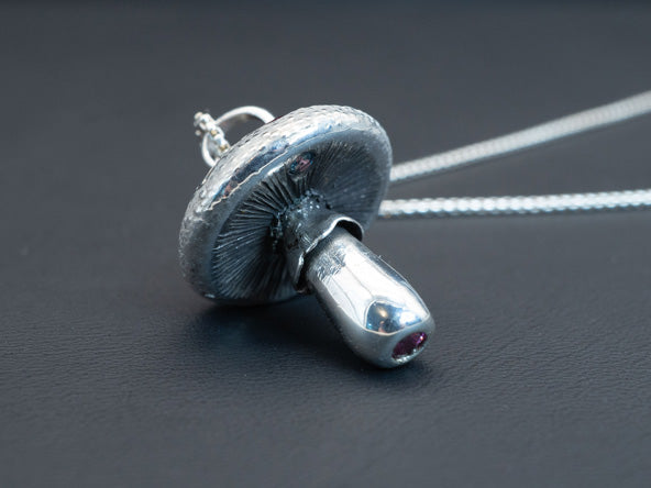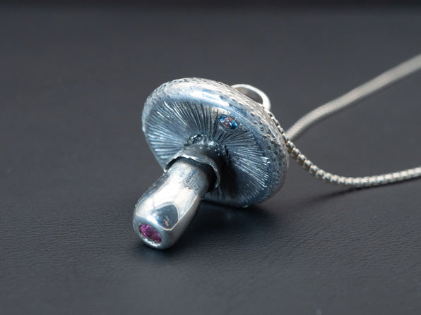 A beautiful 3D Amanita Mushroom pendant. Set with multiple Rhodolite garnets as well as a small sapphire, accented with hand engraved details. Add the beauty of nature to your day and mush love to any outfit.