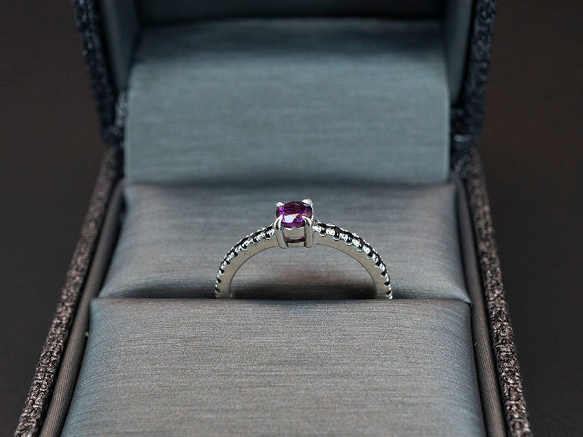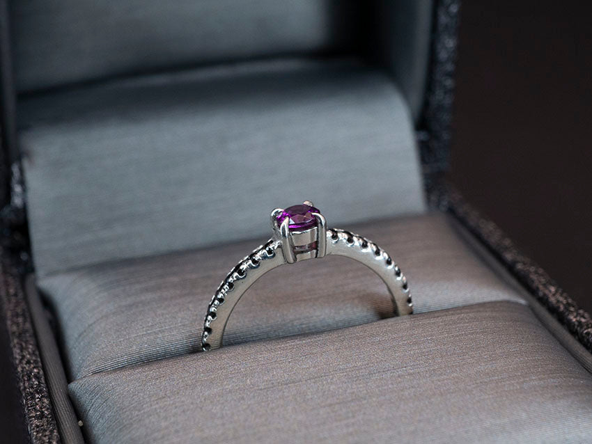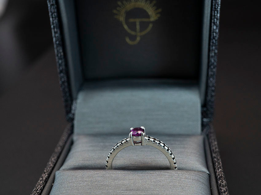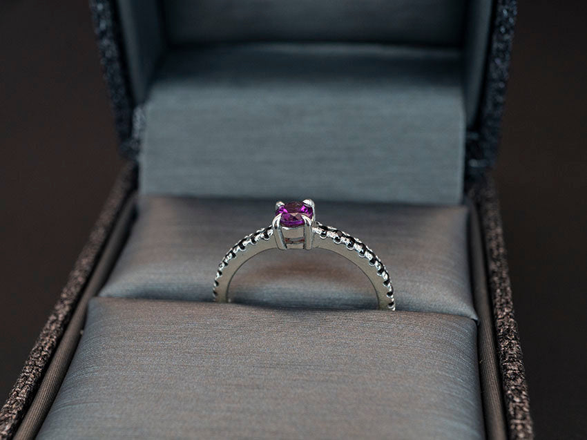 Surrender to the spiritual resonance of twilight with this sublime ring, where the regal purple of natural grape garnet merges with the protective aura of black spinel, both ensconced in the glow of polished .925 silver. Crafted with reverence in a size US 6.5, this ring is not only an ode to the artisan's craft but also a beacon of the crown chakra's wisdom, inviting balance and serenity into your life. Let this ring encircle your finger as a guardian of the spirit, a reminder of the universe's vast beauty and the inner strength it bestows.