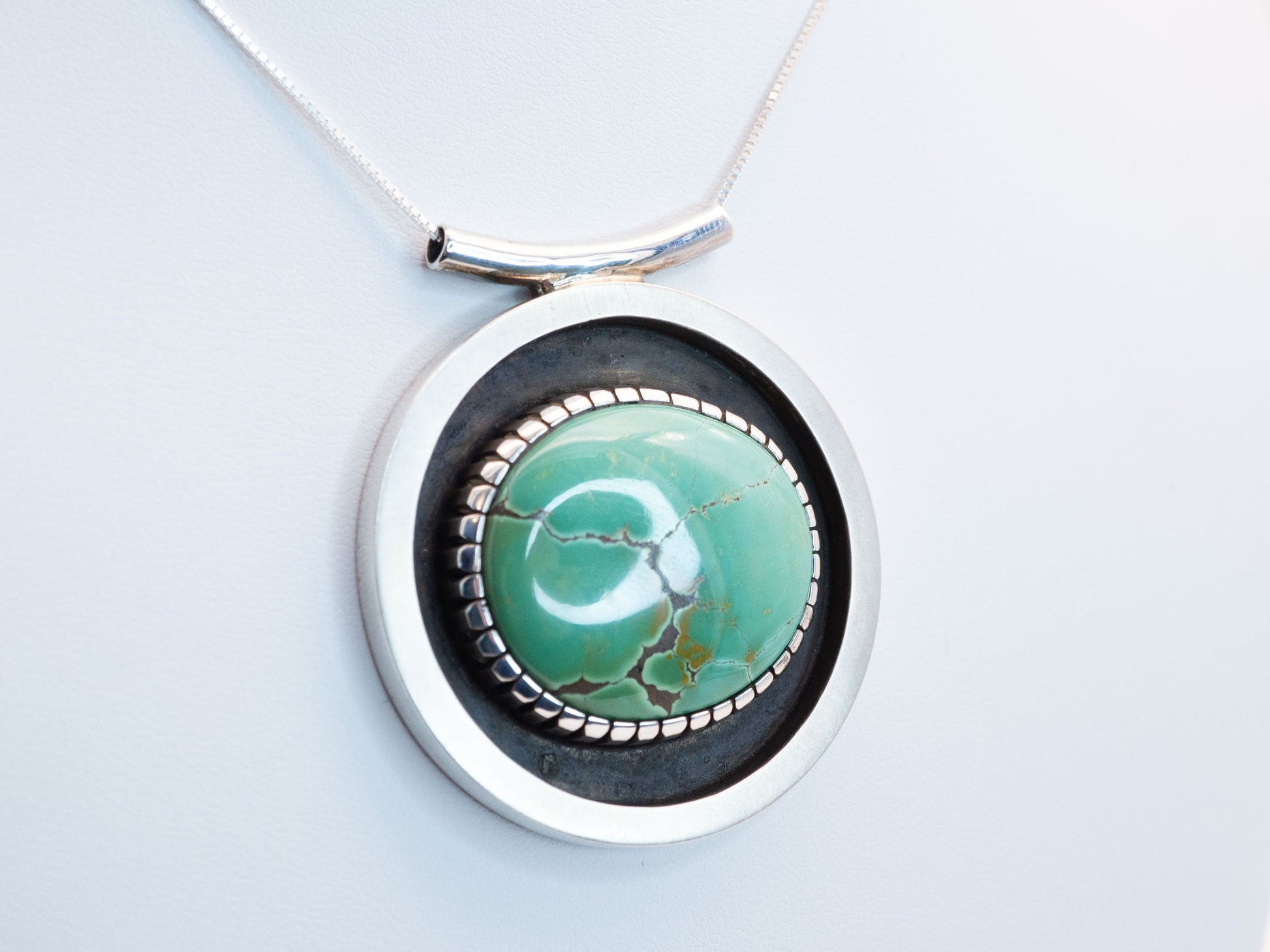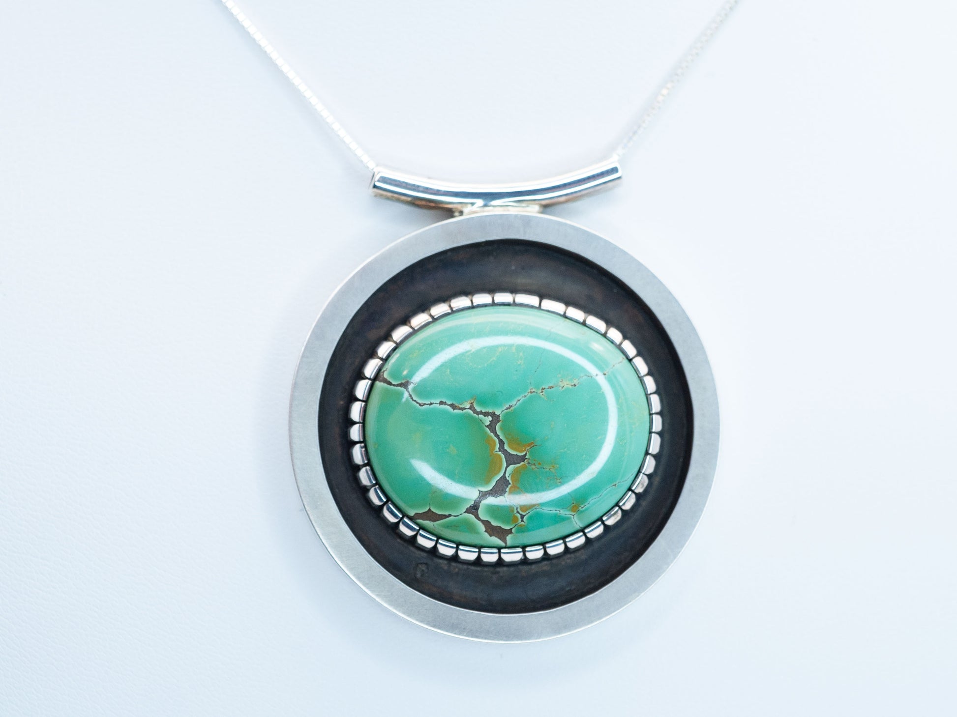 A 58-carat Manassa turquoise—vivid, grounded, alive—set in sterling silver, allowing the stone’s natural patterns to speak without interruption. Turn it over, and the secret reveals itself: an intricate, hand-engraved lattice etched into the back, a quiet geometry meant only for those who look closer.