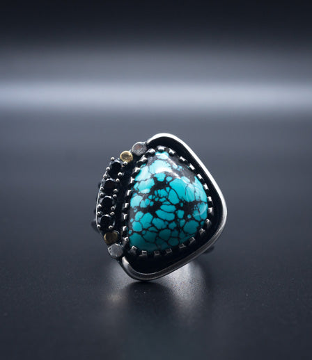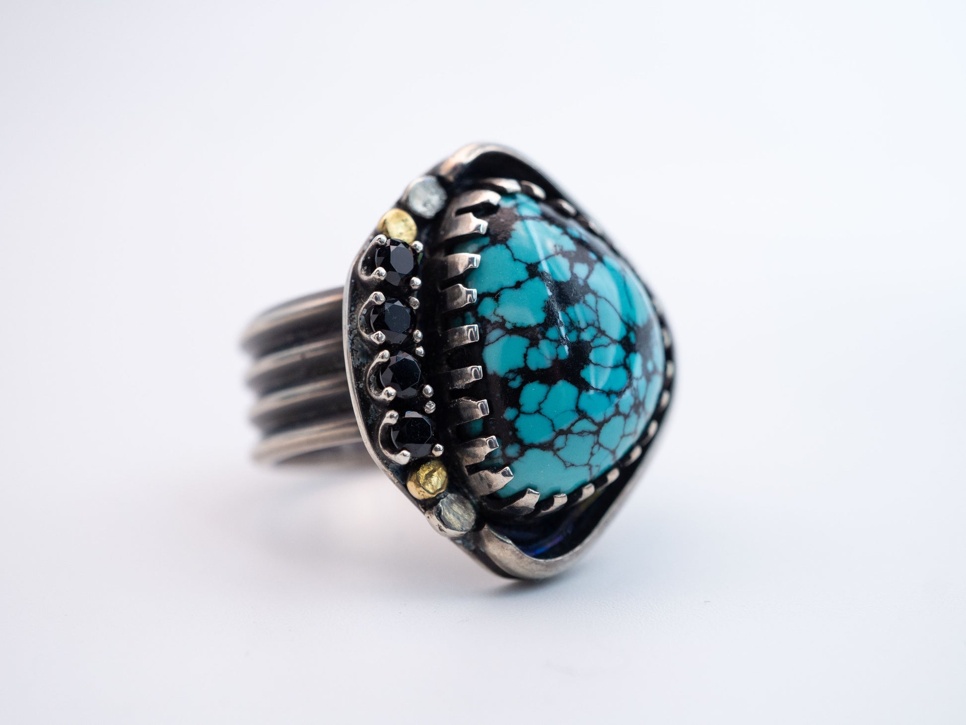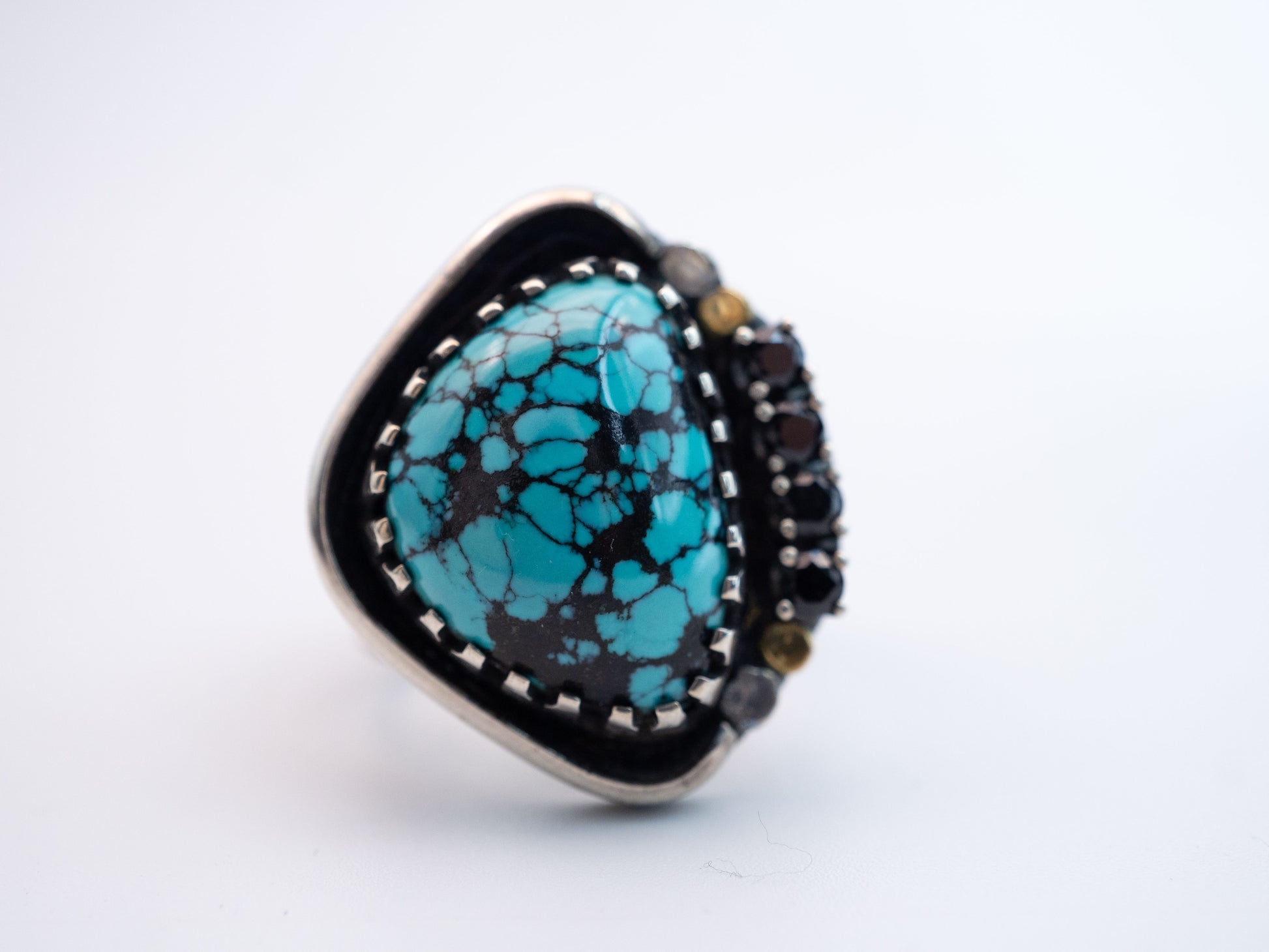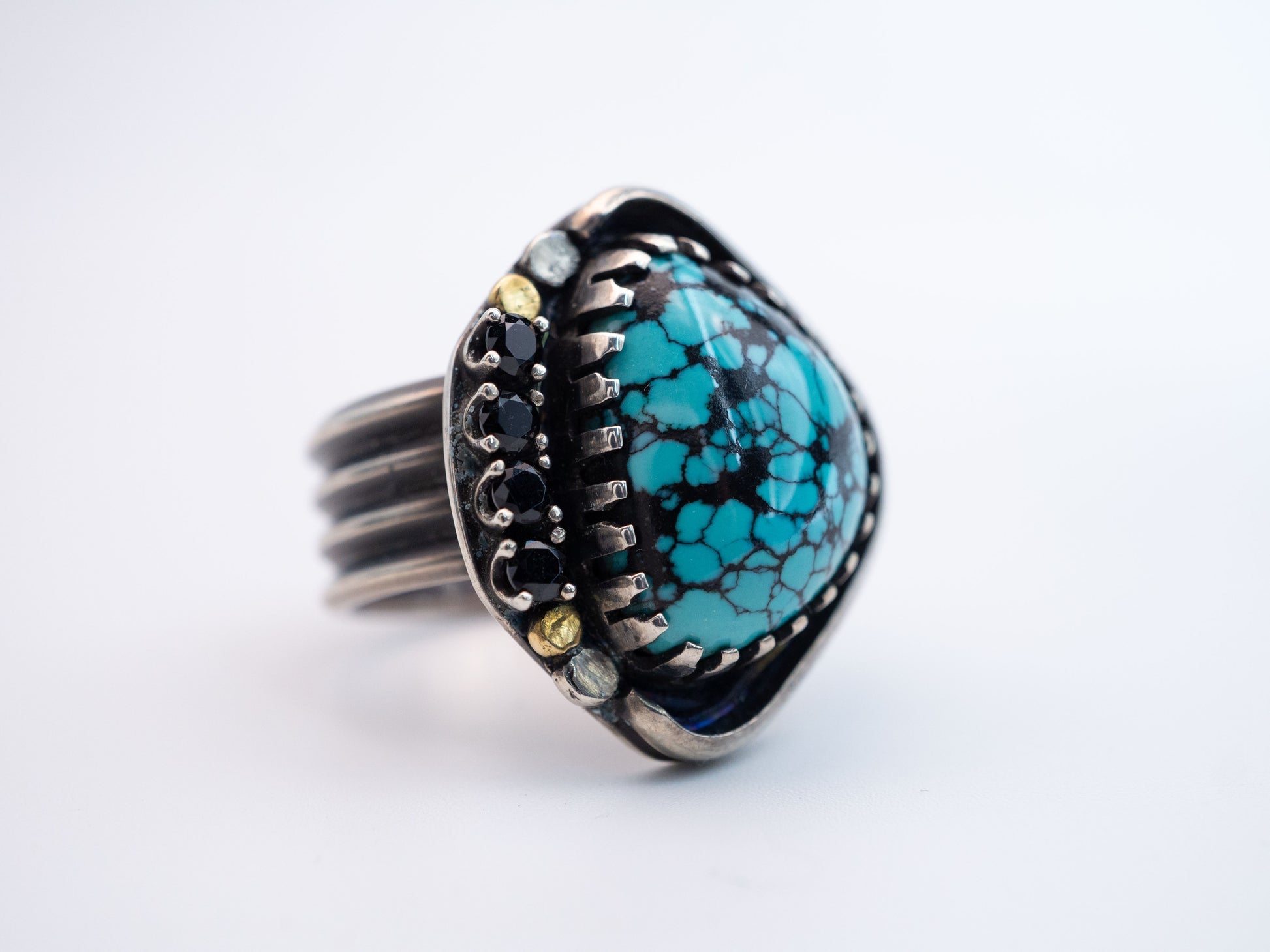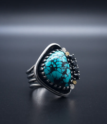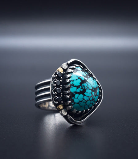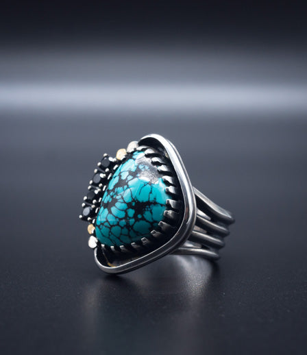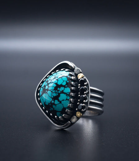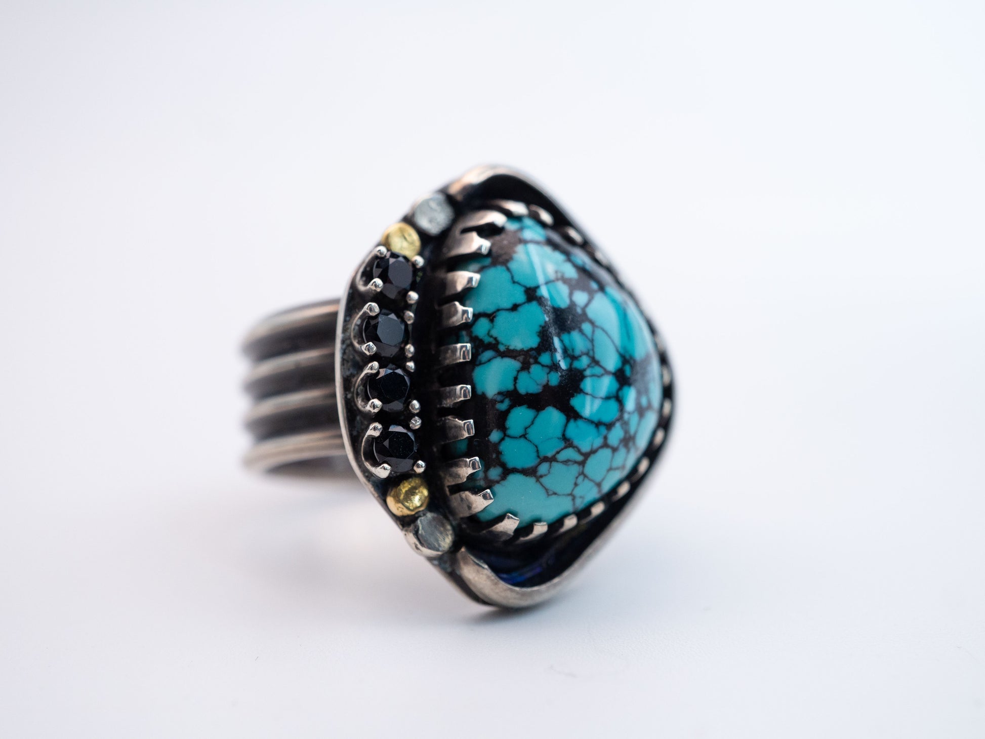 We constructed this ring with the idea of pairing Turquoise with black spinel. The natural black spinel sits as four 3mm round cut faceted stones; adjacent to the spinel we have placed 14k gold accents, which we feel add a lovely contrast to the deep black of the spinel. The main stone is a fantastically bright US mined Turquoise, it rests in a hand fabricated prong setting bordered by a double band of sterling silver. The band on this piece is a thick 2mm x 10mm silver monolith, the ring has an overall heft which gives it a feeling of strength and quality. This ring is constructed as a unisex piece, size 11 (US).