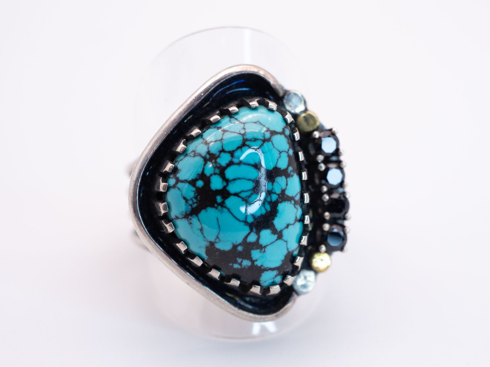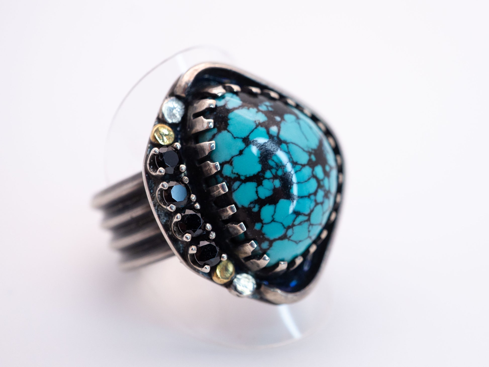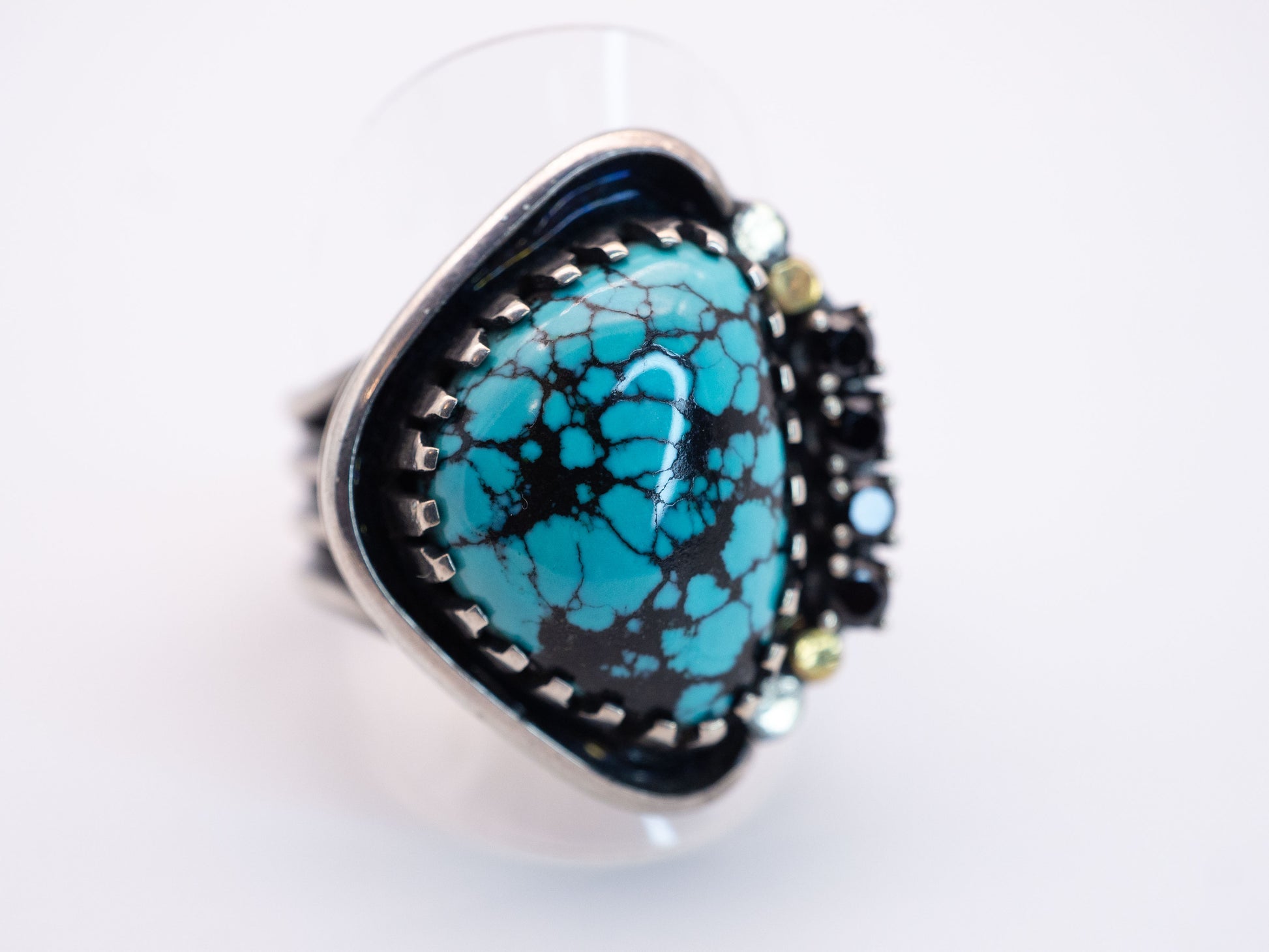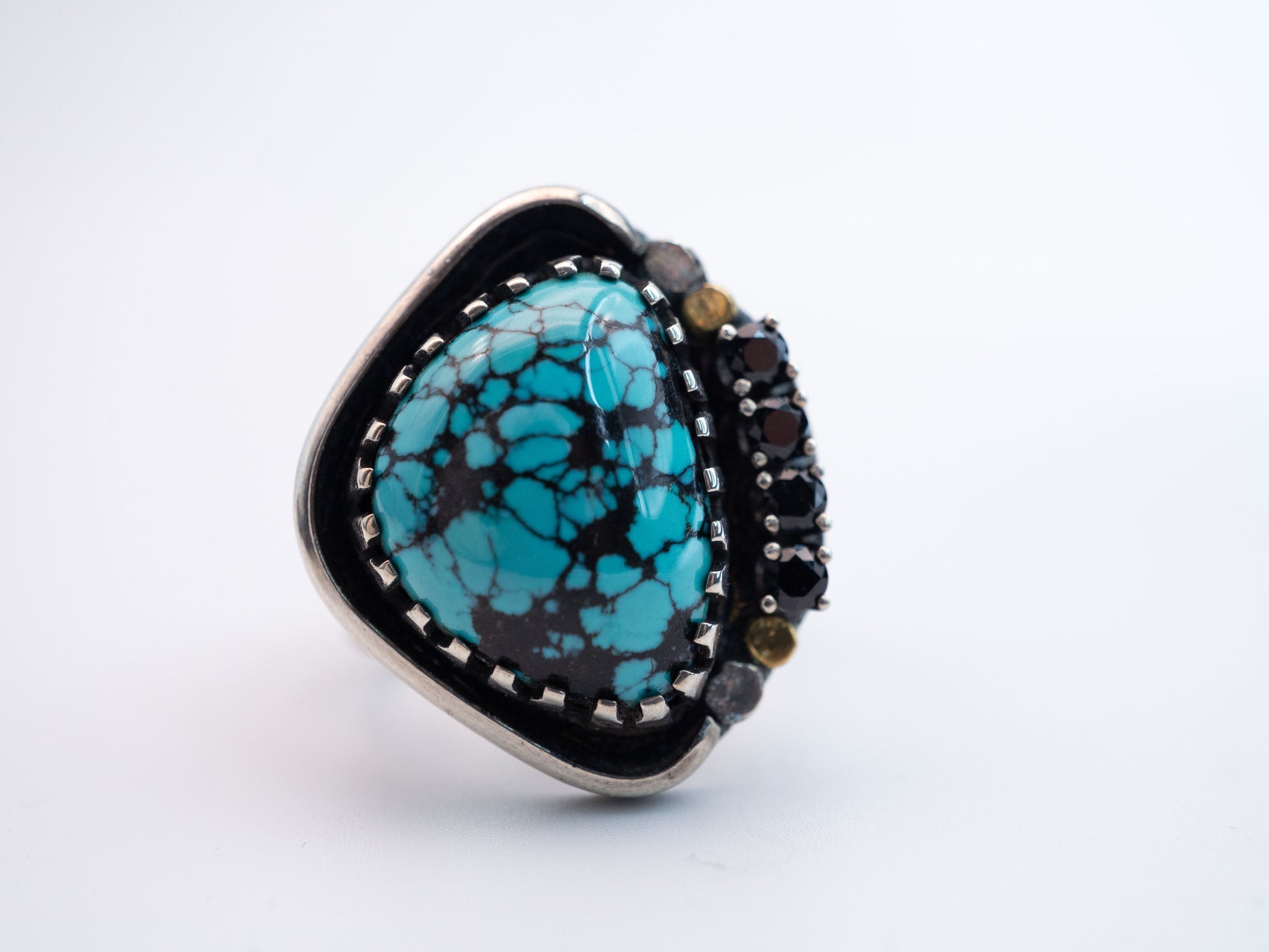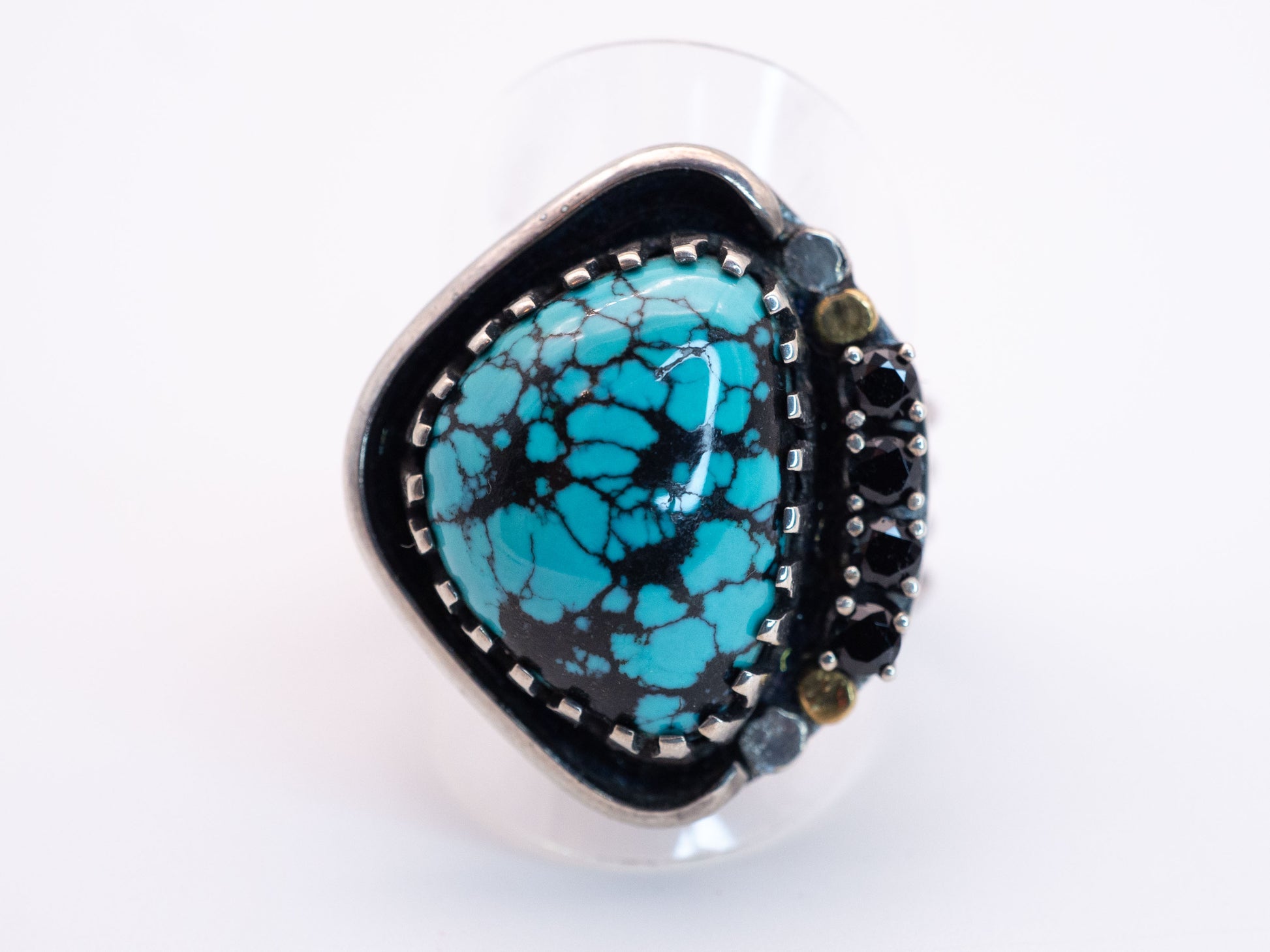 We constructed this ring with the idea of pairing Turquoise with black spinel. The natural black spinel sits as four 3mm round cut faceted stones; adjacent to the spinel we have placed 14k gold accents, which we feel add a lovely contrast to the deep black of the spinel. The main stone is a fantastically bright US mined Turquoise, it rests in a hand fabricated prong setting bordered by a double band of sterling silver. The band on this piece is a thick 2mm x 10mm silver monolith, the ring has an overall heft which gives it a feeling of strength and quality. This ring is constructed as a unisex piece, size 11 (US).