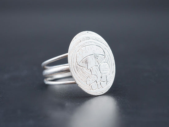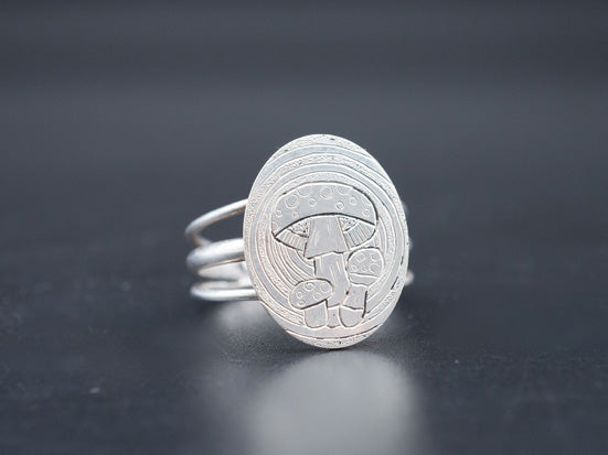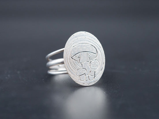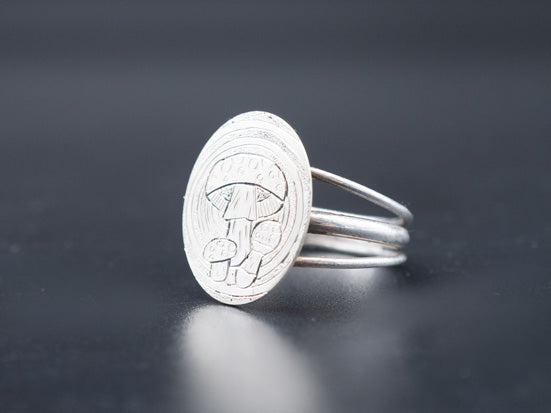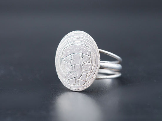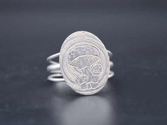 Hand Engraved Amanita Mushroom Signet Ring with geometric background. Add mush love to your day with this beautiful silver ring.